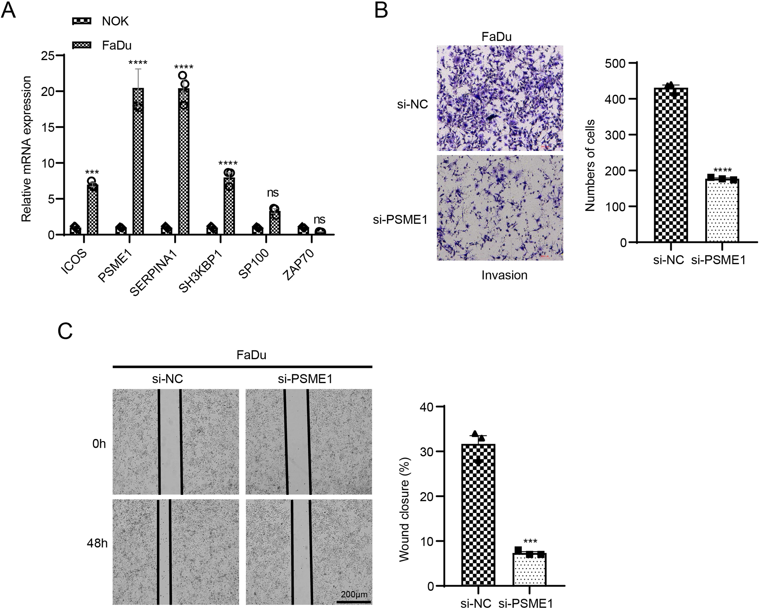 Figure 7. Exploring the biological role of PSME1 in HNSCC. (A) qPCR detection of gene expression levels of ICOS, PSME1, SERPINA1, SH3KBP1, SP100 and ZAP70 in NOK and FaDu cells. (B) Representative images of transwell assay of FaDu cells after PSME1 knockdown and statistical analysis of invasive cell counts. (C) Representative photographs and statistical analysis of wound healing assay in FaDu cells after PSME1 knockdown. Data are shown as SD ± mean, ns, p > 0.05, not statistically significant; ***p < 0.001; ****p < 0.0001.