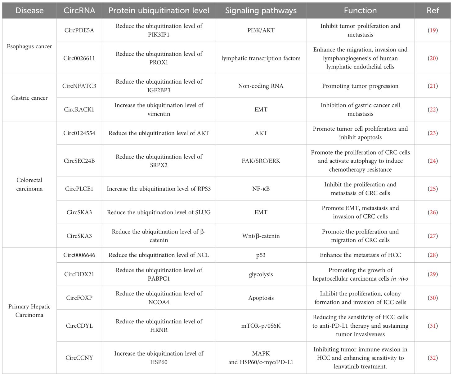 Gastrointestinal cancers include esophageal cancer (EC), gastric cancer (GC), hepatocellular carcinoma (HCC), cholangiocarcinoma (CCA), pancreatic cancer (PC) and colorectal cancer (CRC). Recent reports indicate that circRNAs exhibit abnormal expression in gastrointestinal neoplasms. CircRNAs with abnormal expression influence gastrointestinal cancer through modulating multiple mechanisms (18). Multiple circRNAs have been identified to affect gastrointestinal cancers development through regulating ubiquitination of crucial oncoproteins or tumor suppressive proteins (Figures 1, 2, Table 1).
