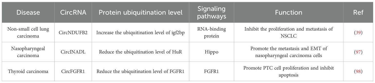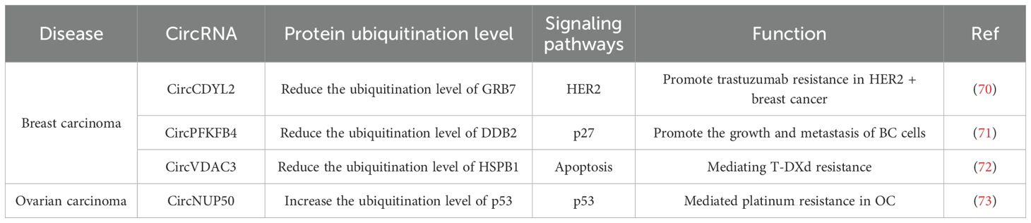 Although the mechanism by which circRNAs regulate protein ubiquitination remains to be elucidated, nevertheless, it is anticipated that investigations into circRNA-based therapeutic strategies will lay a foundational groundwork for novel approaches to drive the advancement of precision cancer treatment in the future.