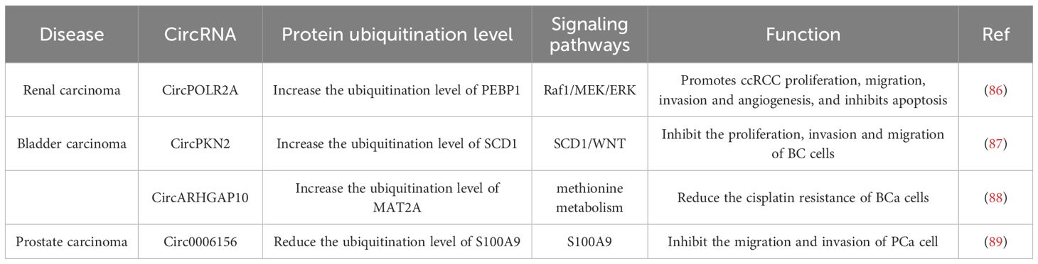 Zhang et al. aimed to investigate differentially expressed circRNAs in prostate cancer (PCa) tissue. They conducted high-throughput circRNA sequencing on two pairs of PCa and matched adjacent non-tumor tissue samples and discovered that circ0006156 was expressed at low levels in PCa tissues. It was also ascertained that the protein expression of Protein S100-A9(S100A9) was positively regulated by the overexpression of circ0006156, and that circ0006156 was negatively correlated with the aggressive phenotypes of PCa cells (89). Consistently, circ0006156 suppresses PCa cell metastasis by stabilizing S100A9 in an in-vivo setting. The S100A9 protein is a member of the S100 protein family. Numerous prior investigations have demonstrated that the expression level of S100A9 in PCa tissues is significantly lower than that in benign prostatic hyperplasia tissues, thereby implying that the S100A9 protein serves as a suppressor of prostate cancer progression (96). Circ0006156 binds to and stabilizes S100A9 by obstructing ubiquitination. The specific mechanism is that circ0006156 binds to the S100A9 protein and prevents E-3 ubiquitin-protein ligases from binding to the S100A9 protein. This action reduces the degradation of the S100A9 protein, thereby inhibiting the migration and invasion of PCa cells (89). After silencing of circ0006156, the overexpression of the S100A9 protein is also capable of inhibiting the migration and invasion of PCa cells. These findings unequivocally demonstrate that circ0006156 functions as a tumor suppressor by modulating the ubiquitination process of the S100A9 protein and maintaining the stability of S100A9 protein expression, thereby effectively inhibiting the migration and invasion of PCa cells (89).
