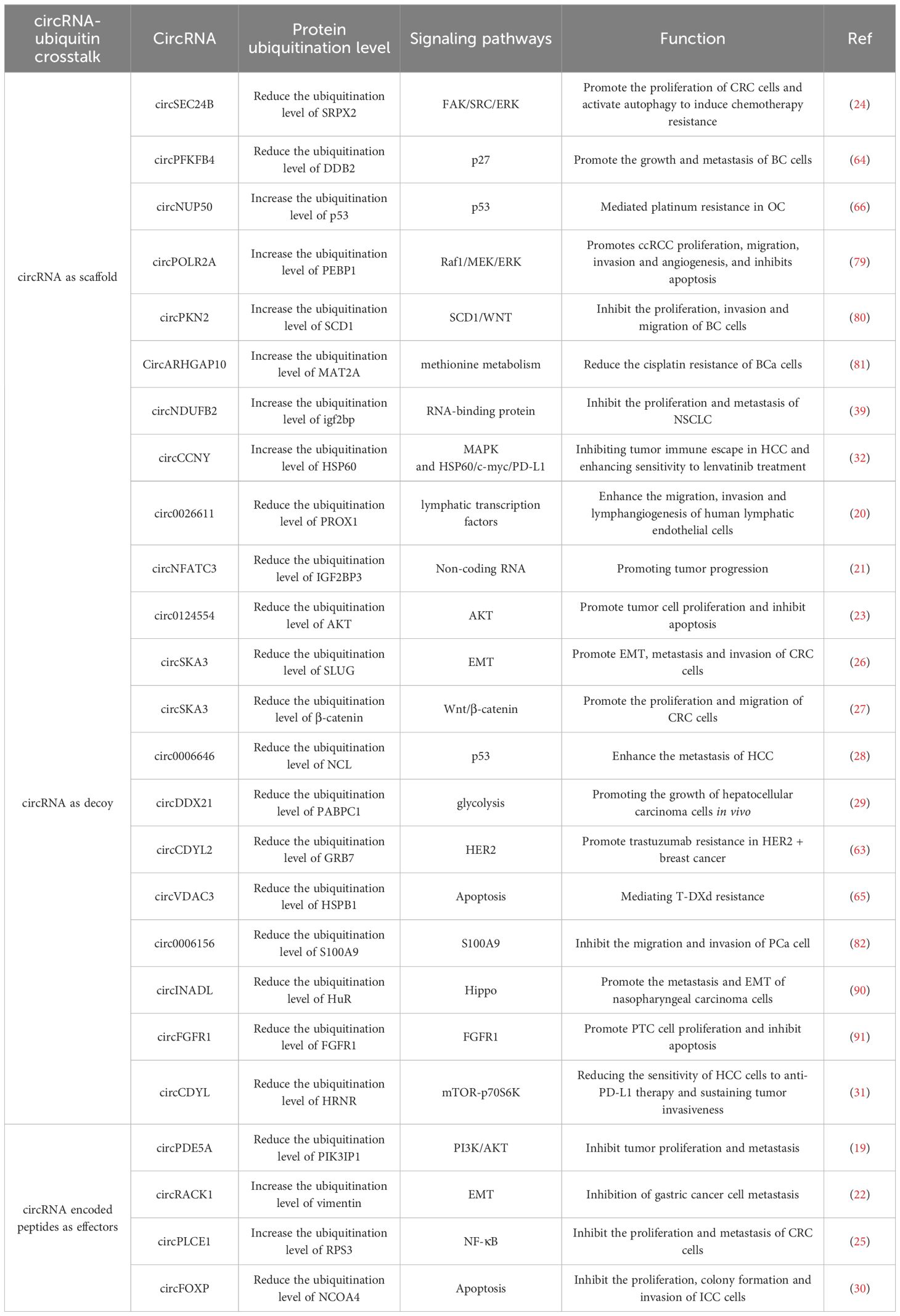 1. CircRNAs promote the ubiquitination and degradation of target proteins. Currently, numerous studies have demonstrated that circRNAs are involved in promoting the degradation of key proteins in malignant tumors via multiple mechanisms. Firstly, circRNAs can directly bind to target proteins and E3 ligases, functioning as protein-protein scaffolds, which enhances the activity of E3 ligases and facilitates the ubiquitination of target proteins. Examples of such circRNAs include circNUP50, circPOLR2A, circPKN2, circARHGAP10, circNDUFB2, and circPFKFB4. Secondly, certain circRNAs are capable of encoding proteins that indirectly facilitate the ubiquitination of target proteins. For instance, circRACK1 and circPLCE1 are examples of such circRNAs. (Table 5).