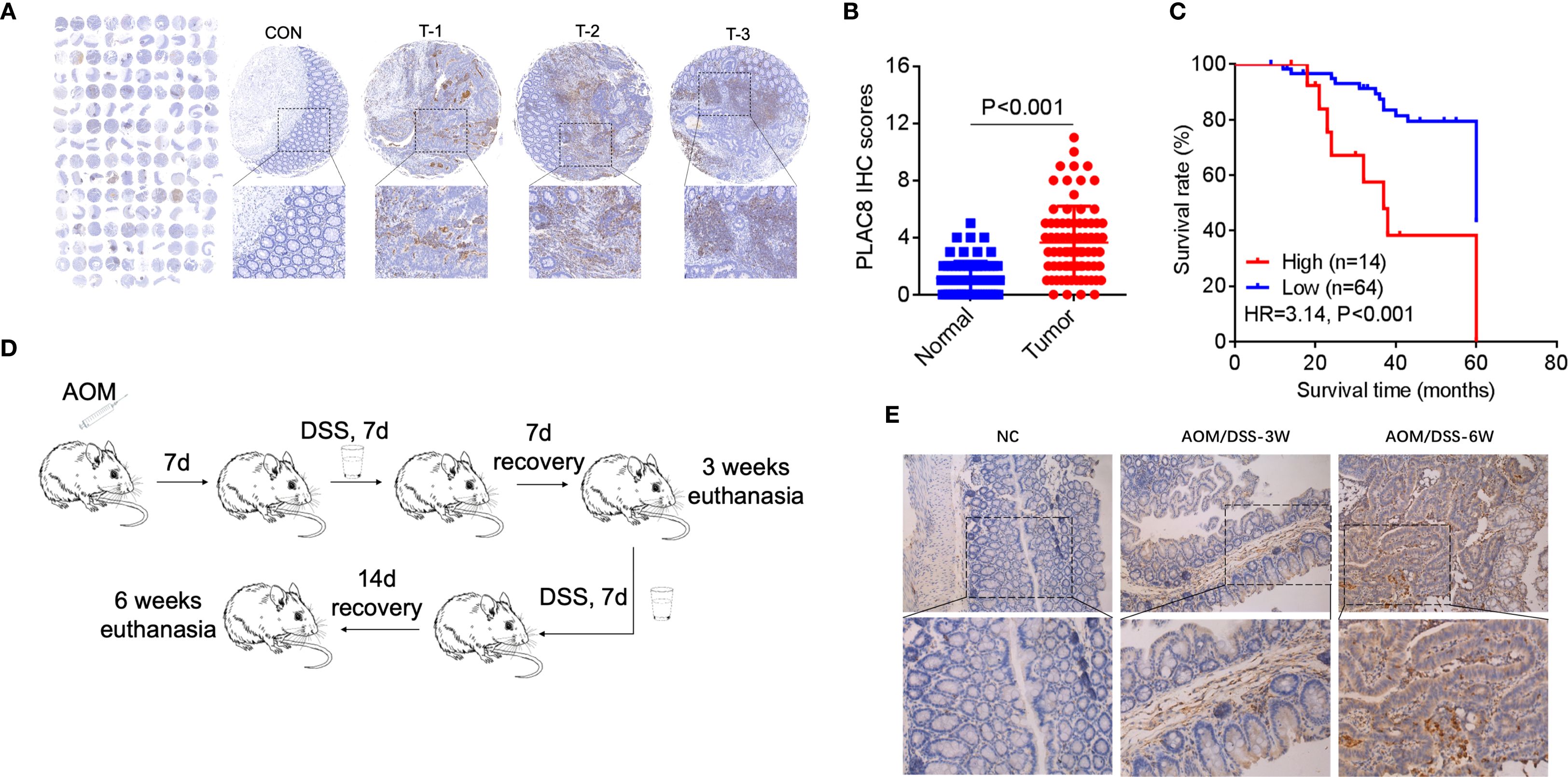 Figure 1. (A) PLAC8 IHC in tissue microarray (78 tumor/normal pairs). CON: normal adjacent tissue; T-1/T-2/T-3: representative PLAC8 protein highly expression tumor tissues. (B) Comparative IHC scores between tumor and normal tissues. (C) Patients were stratified into subgroups based on PLAC8 IHC scoring criteria and survival status, followed by Kaplan-Meier survival curve analysis with log-rank testing. (D) The colorectal cancer chemoprevention model was established through sequential administration of azoxymethane (AOM) and dextran sulfate sodium (DSS) in C57BL/6 mice. (E) PLAC8 protein expression dynamics were analyzed throughout the tumorigenesis process. (Student’s t-test for comparisons).