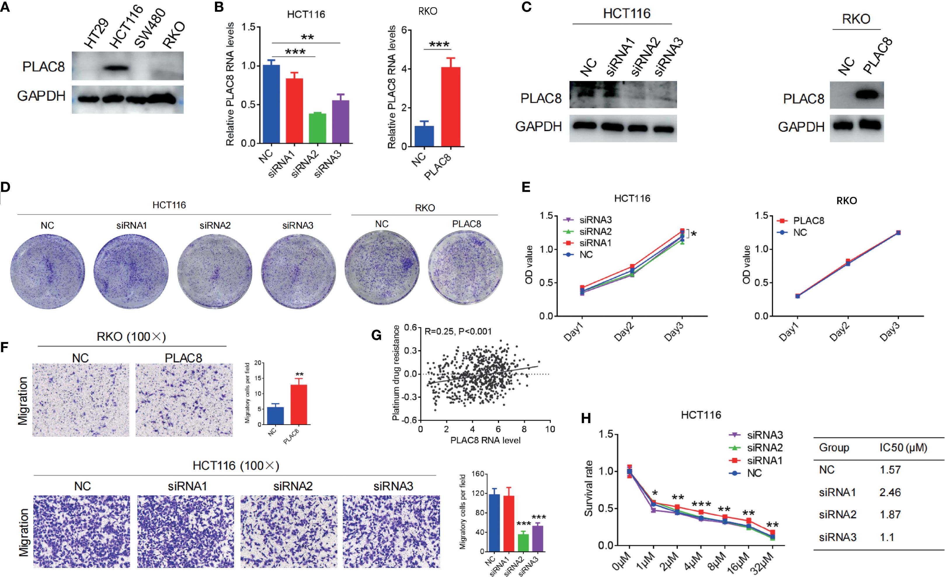 Figure 2. (A) PLAC8 expression in four CRC cell lines. (B, C) PLAC8 overexpression and knockdown conducted in lower and higher PLAC8 expression CRC cell lines. (D, E) Impact of PLAC8 expression changes on cell clonogenicity and proliferation. (F) Transwell assay assessing PLAC8 expression on migration of CRC cell lines. (G) TCGA-based bioinformatic analysis to explore PLAC8 involvement in platinum resistance. (H) Impact of PLAC8 expression changes on oxaliplatin resistance (Student’s t-test for comparisons; *, **, and *** represent P < 0.05, P < 0.01, and P < 0.001, respectively; GSVA for enrichment).