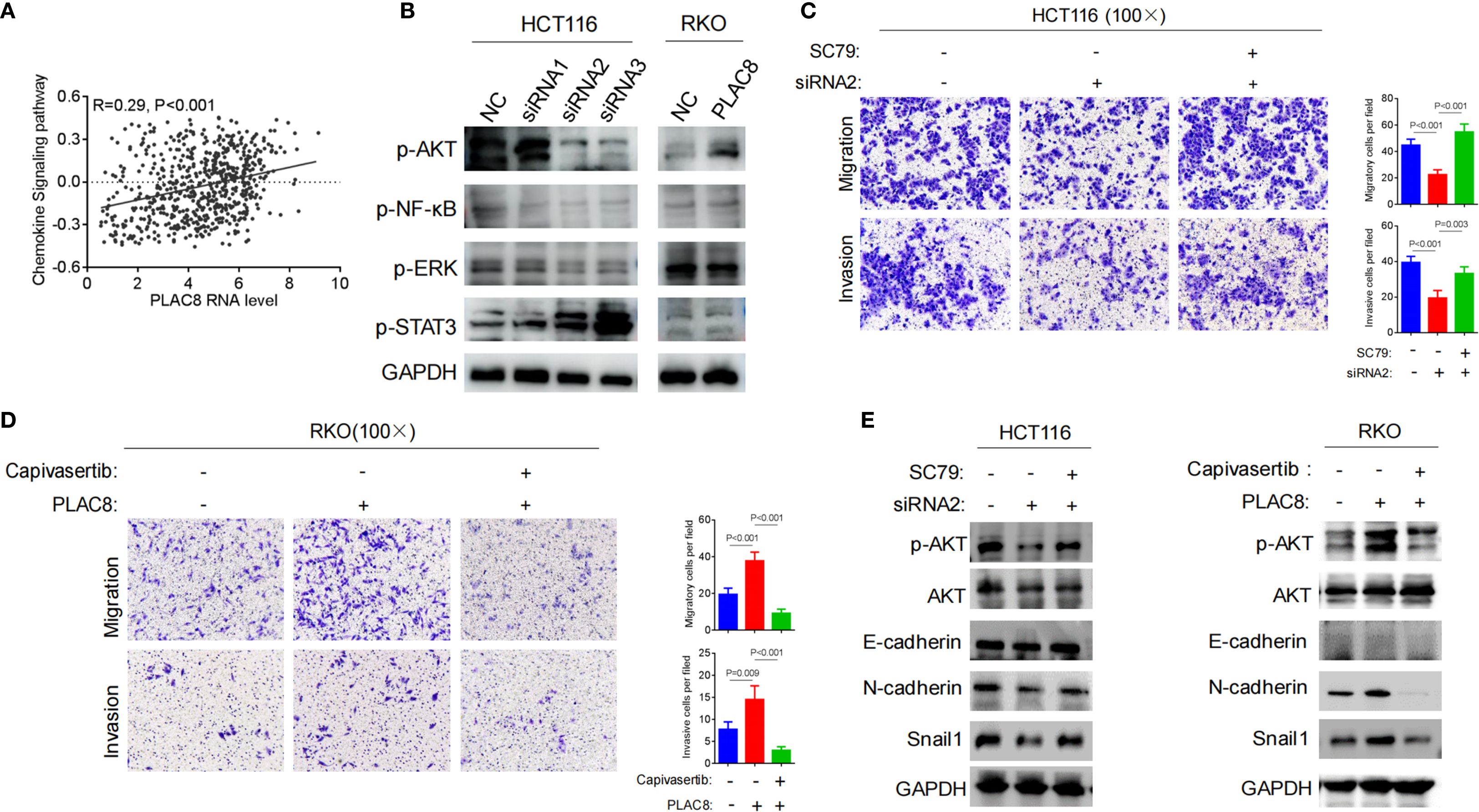 Figure 3. (A) TCGA-based bioinformatic analysis to explore PLAC8 involvement in chemokine signaling. (B) Effect of PLAC8 expression changes on inflammation and cytokine-related signaling pathways. (C) Reversal by AKT pathway activator SC79, the reduction in migration and invasion abilities induced by PLAC8 knockdown. (D) Reversal by AKT inhibitor capivasertib, the enhanced migration and invasion abilities of colorectal cancer cells induced by PLAC8 overexpression. (E) Effects of PLAC8 modulation and AKT pathway activator and inhibitor on EMT-related protein expression. (GSVA for enrichment).