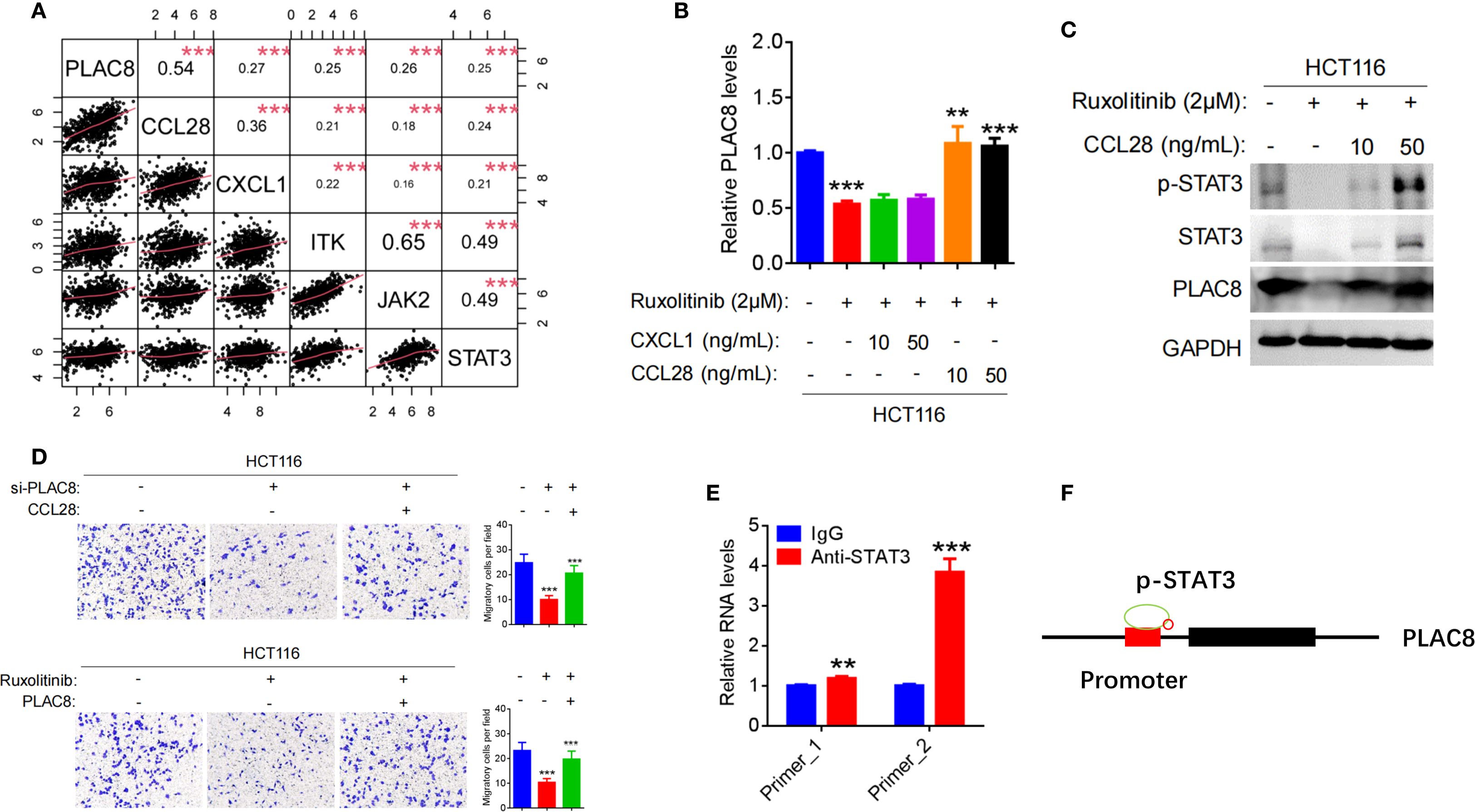 Figure 4. (A) Pearson correlation analysis between PLAC8 expression and the top five inflammatory cytokine pathways gene based on the TCGA database. (B) Regulation of PLAC8 mRNA expression by Ruxolitinib (STAT3 inhibitor), CXCL1, and CCL28. (C) Regulation of STAT3 signaling and PLAC8 protein expression by Ruxolitinib and CCL28. (D) Effects of combined PLAC8 knockdown and CCL28 treatment, or STAT3 inhibition and PLAC8 overexpression, on CRC cell migration. (E, F) Validation of STAT3 binding to the PLAC8 promoter by CUT&Tag. (**, and *** represent P < 0.01, and P < 0.001, respectively).