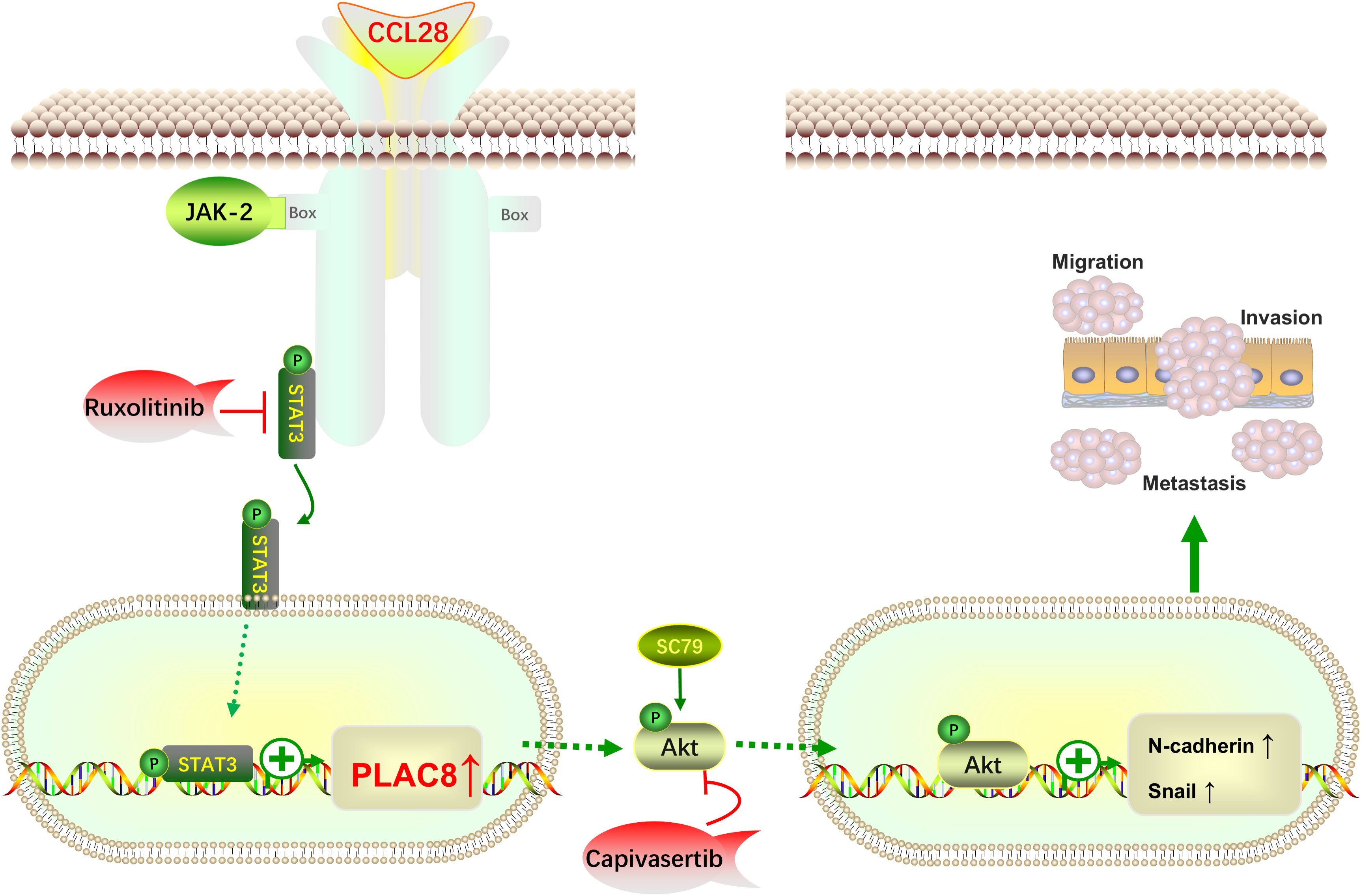 Figure 5. Schematic illustrating how the CCL28-STAT3-PLAC8 axis promotes EMT and enhances CRC invasion and metastasis via AKT signaling activation.
