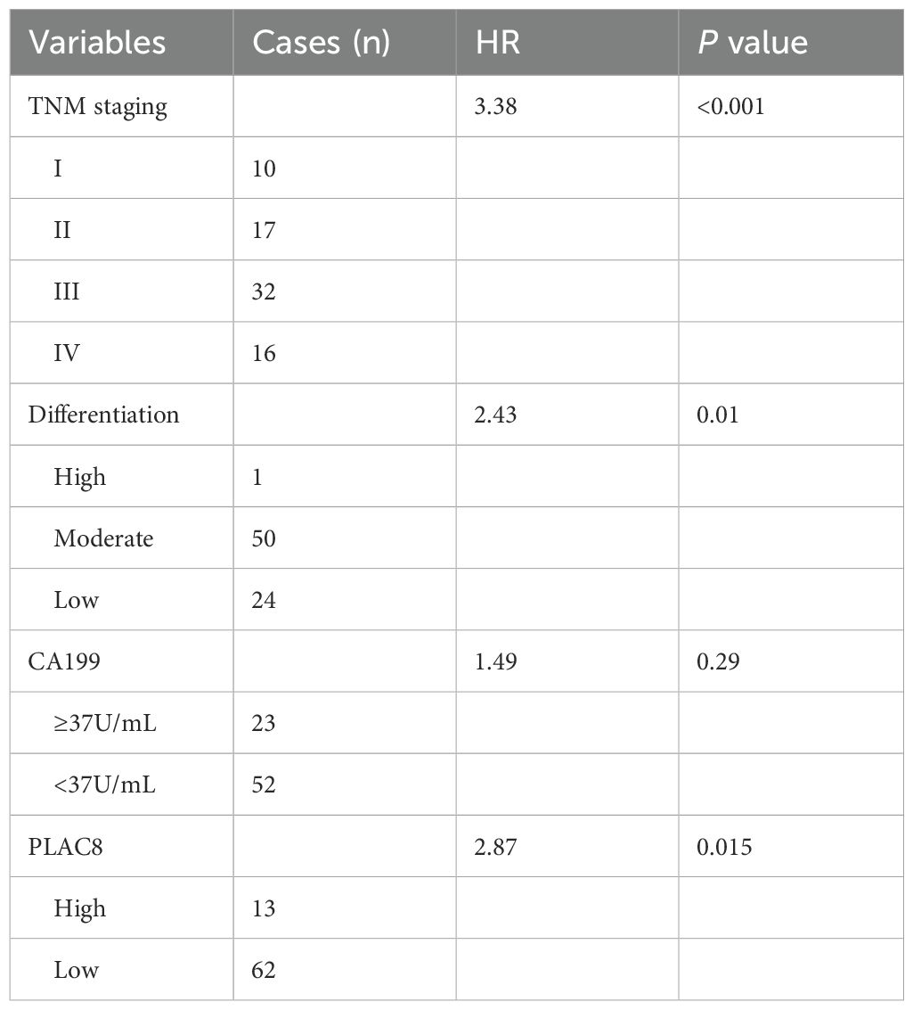 Numerous studies have identified PLAC8 as an oncogene associated with poor prognosis in various types of cancers. As a centrosomal oncoprotein, PLAC8 plays a pivotal role in driving colorectal cancer progression by promoting tumor growth and metastasis (21). A total of 78 CRC cases were included in this study. PLAC8 protein expression in tumor tissues and adjacent normal tissues was analyzed, and its association with clinicopathological characteristics and patient prognosis was evaluated. Results demonstrated that PLAC8 was significantly overexpressed in CRC tissues and negatively correlated with patient prognosis. Univariate Cox regression analysis confirmed that high PLAC8 expression, advanced T, N, and M stages, poor tumor differentiation, and elevated CA199 levels were significantly associated with advanced disease stage and poor prognosis. Moreover, multivariate Cox regression analysis identified high PLAC8 expression, higher TNM stage, and poor tumor differentiation as independent prognostic risk factors for CRC. In colorectal cancer, this study further confirms the oncogenic role of PLAC8 and demonstrated its association with tumor TNM stage, suggesting that PLAC8 may play an important role in tumor invasion and metastasis.