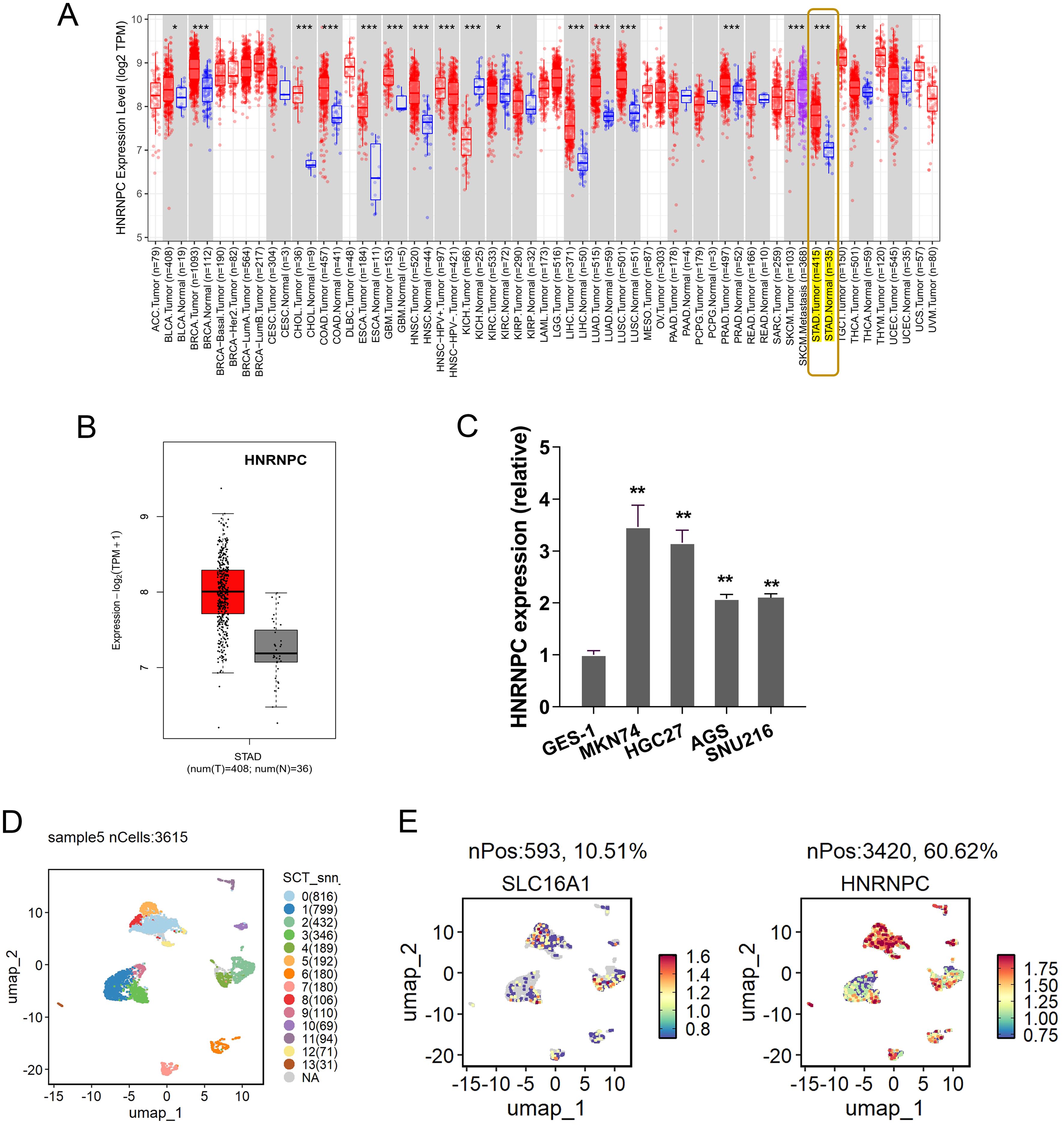Figure 1. Elevated HNRNPC expression in GC. (A) The HNRNPC expression was tested in multitudinous human cancers, especially the GC (http://timer.cistrome.org/). (B) In the public dataset, the HNRNPC level significantly over-regulated as comparing to normal control group (http://gepia.cancer-pku.cn/index.html). (C) The HNRNPC level in GC cells (MKN74, HGC27, AGS). (D) The scRNA-seq in the GC samples (GSE183904). (E) SLC16A1 (MCT1) and HNRNPC high-regulation in the GC samples. **p<0.01. *p<0.05. ***p<0.001.