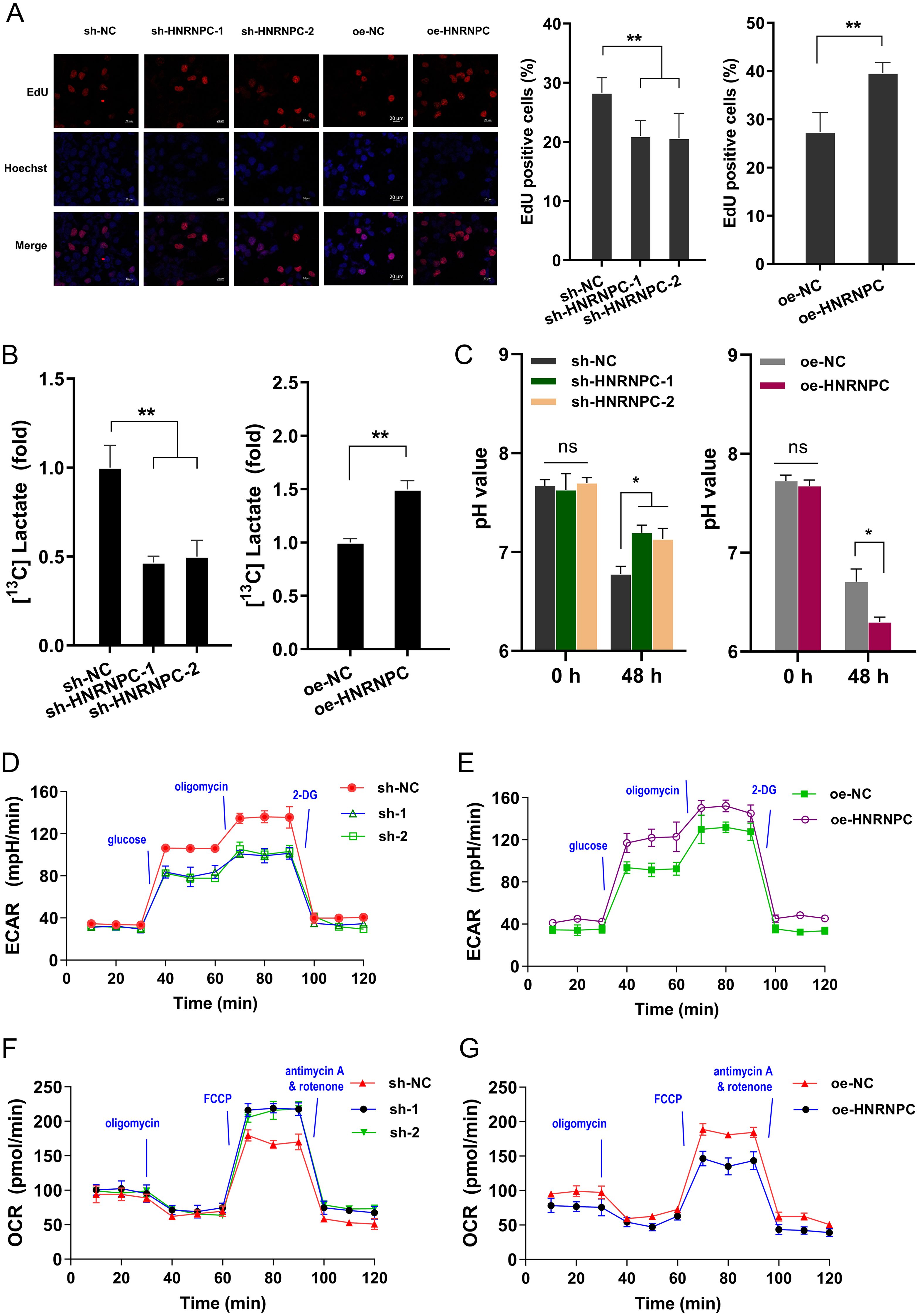 Figure 2. HNRNPC positively fortified the aerobic glycolysis and lactate accumulation in GC. (A) The proliferation assay by EdU assays indicated the proliferation of GC (MKN74) cells with stably HNRNPC silencing (sh-HNRNPC-1, sh-HNRNPC-2) and HNRNPC over-expression. (B) Lactate production was measured in MKN74 cells with stably HNRNPC silencing (sh-HNRNPC-1, sh-HNRNPC-2) and HNRNPC over-expression by isotope tracing 13C manner. (C) The pH value of the culturing medium of GC cells with HNRNPC silencing or overexpression. (D, E) The extracellular acidification rate was tested after transfection of MKN74 cells with HNRNPC silencing or overexpression. (F, G) The oxygen consumption rate (OCR) was tested after transfection of MKN74 cells with HNRNPC silencing or overexpression. *p<0.05; **p<0.01. NS is "no significant".