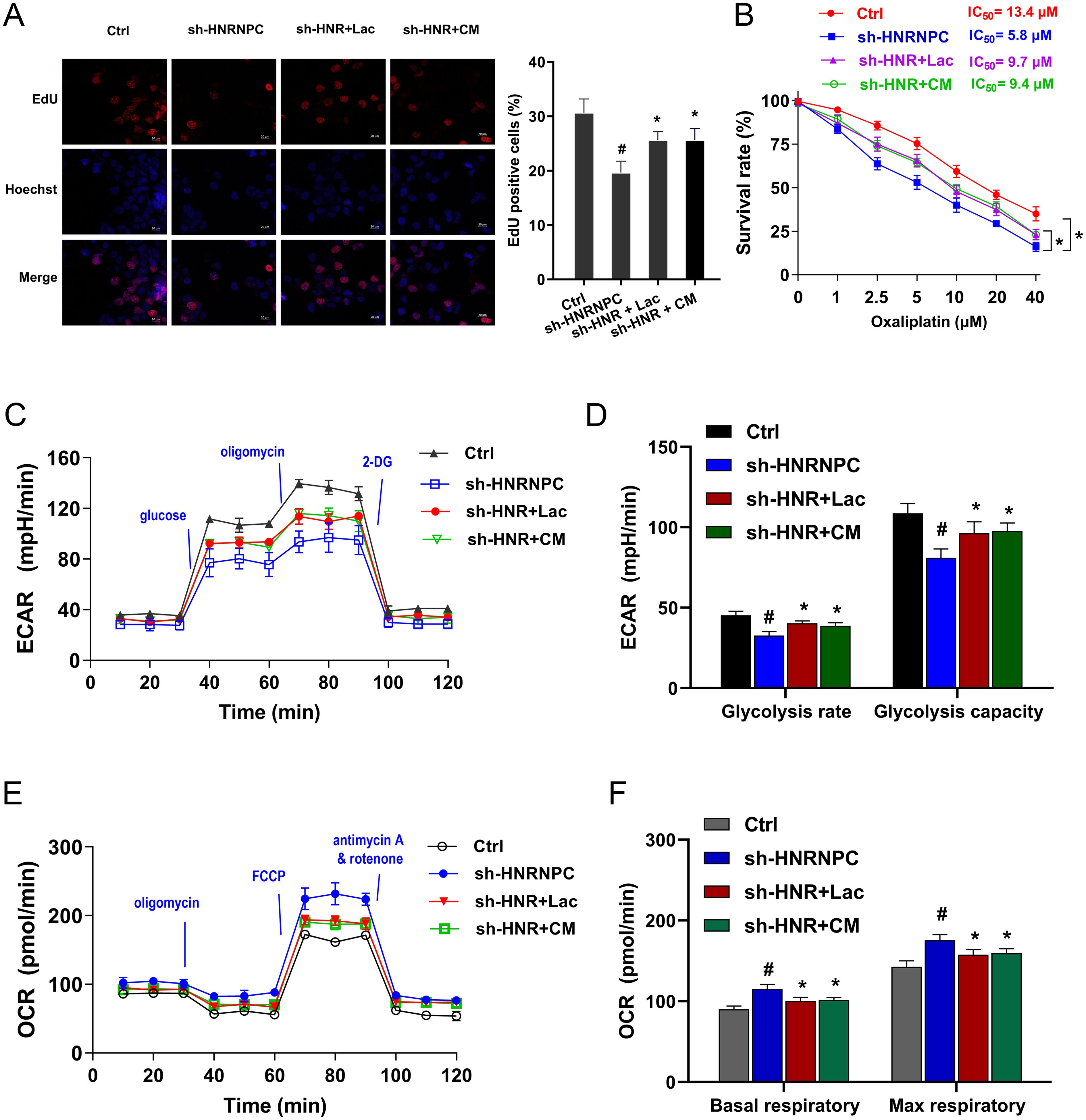Figure 3. Exogenous lactate accelerated the proliferation, oxaliplatin resistance and aerobic glycolysis in GC that inhibited by HNRNPC silencing. (A) EdU assays were performed in the GC (MKN74) cells with stably HNRNPC silencing (sh-HNRNPC-1). Besides, the GC cells were also treated with exogenous lactate, including lactate (L-lactate) and conditioned medium (CM). (B) The oxaliplatin chemotherapy sensitivity test by CCK - 8 showed the half maximal inhibitory concentration (IC50) of GC cells toward oxaliplatin. (C, D) The ECAR analysis revealed the glycolytic capacity and glycolytic rate of GC cells with HNRNPC silencing and lactate and CM treatment. (E, F) The OCR analysis unveiled the basal and maximal respiratory rate levels of GC cells with HNRNPC silencing and lactate and CM treatment. #p<0.05 relative to Ctrl group; *p<0.05, **p<0.01 relative to sh-HNRNPC group.