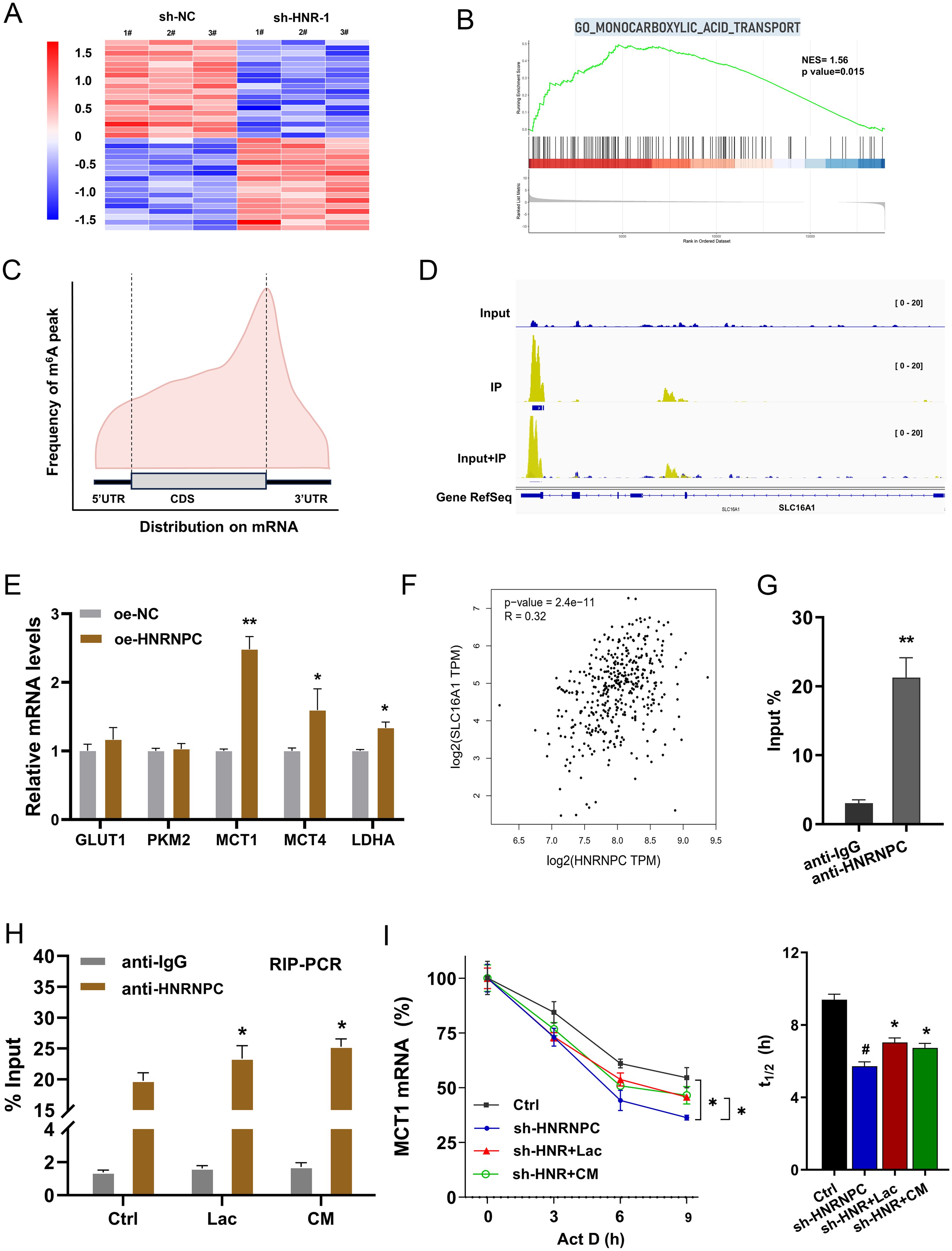 Figure 5. MCT1 was identified as the downstream target of HNRNPC. (A) Heatmap showed the RNA-Seq with sh-NC and sh-HNR-1#. (B) GSEA of the RNA-Seq. (C) The distribution of m6A peaks in GC transcript detected by MeRIP-seq. (D) The seq-data of the 3’-UTR of MCT1 gene was shown by the visualization tool (IGV, Integrative Genomics Viewer). (E) The several aerobic glycolysis related elements (GLUT1, PKM2, MCT1, MCT4, LDHA) were detected by RT-PCR. (F) In the public database (GEPIA, http://gepia.cancer-pku.cn/index.html), the correlation analysis within HNRNPC expression and MCT1 (SLC16A1 gene) level in STAD (Stomach adenocarcinoma) samples. (G) The RIP-PCR assay was performed to identify the interaction within the HNRNPC and MCT1 mRNA in GC cells. (H) The RIP-PCR assay was performed to explore the binding within HNRNPC and MCT1. (I) The RNA decay assay illustrated the MCT1 mRNA stability (half life time, t1/2) in GC cells with HNRNPC silencing, and the lactate or CM treatment. *p<0.05, **p<0.01 relative to NC or IgG group. #p<0.05 relative to Ctrl group.