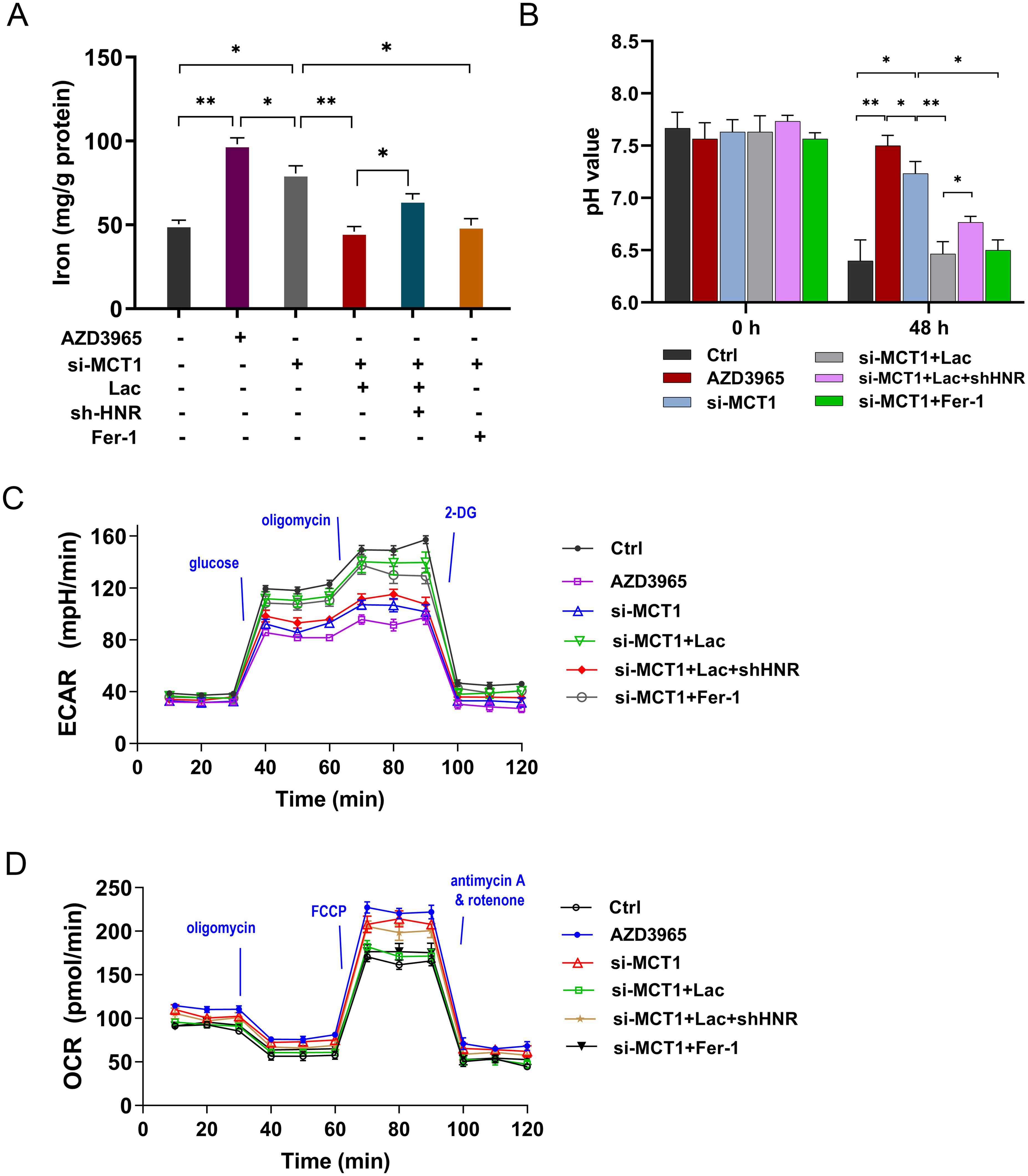 Figure 6. HNRNPC targeted MCT1 to fortify the lactate accumulation in GC, thereby accelerating the aerobic glycolysis and ferroptosis resistance. (A) The iron concentration was tested in GC cells (MKN74) with AZD3965 (MCT1 special inhibitor), MCT1 small interfering RNA (si-MCT1), L-lactate (Lac, 20 mmol/L), conditioned medium (CM), Ferrostatin-1 (Fer-1, 10 μM) and HNRNPC silencing (sh-HNRNPC). (B) The pH value of each group was tested. (C) The ECAR analysis revealed the glycolysis of GC cells. (D) The OCR analysis unveiled the respiratory rate levels of GC cells. *p<0.05, **p<0.01 relative to linked group.