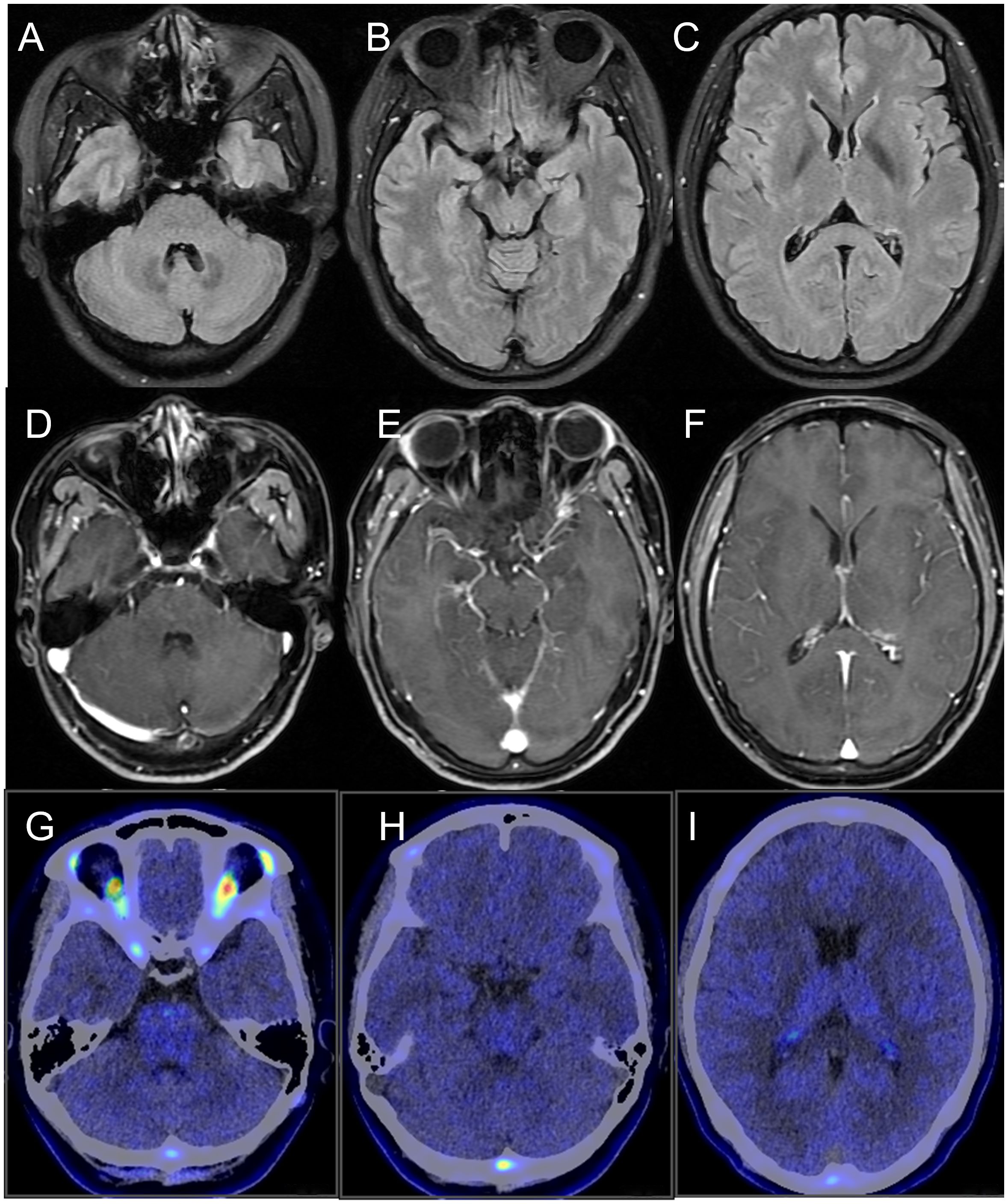 Figure 1. Neuroimaging of the patient. (A-C) brain MRI fluid-attenuated inversion recovery sequence; (D-F) brain MRI T1-weighted contrast-enhanced sequence; (G-I) brain 18F-DPA714 PET/CT. No abnormalities were detected.