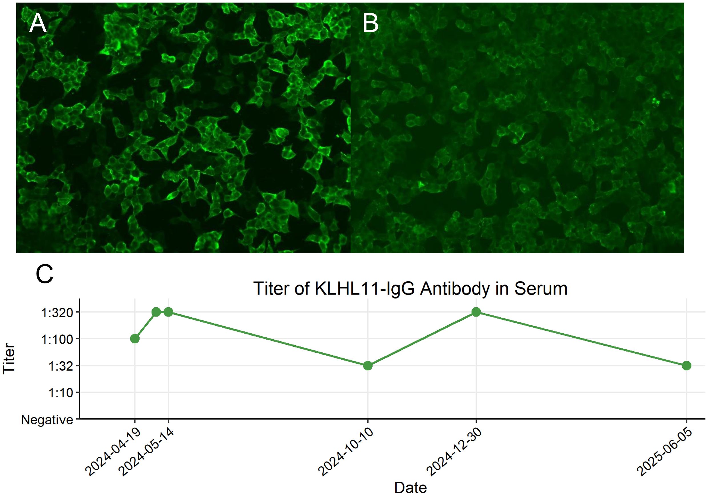 Figure 2. Cell-based assay fluorescence images demonstrating KLHL11 IgG positivity in serum and cerebrospinal fluid (CSF) and longitudinal monitoring of serum KLHL11-IgG titers. (A) Fluorescent antibody staining showing KLHL11 antibody expression in the first serum sample (titer 1:100). (B) Fluorescent antibody staining showing KLHL11 antibody expression in the first CSF sample (titer 1:3.2). (C) Longitudinal changes in serum KLHL11-IgG titers during the clinical course.