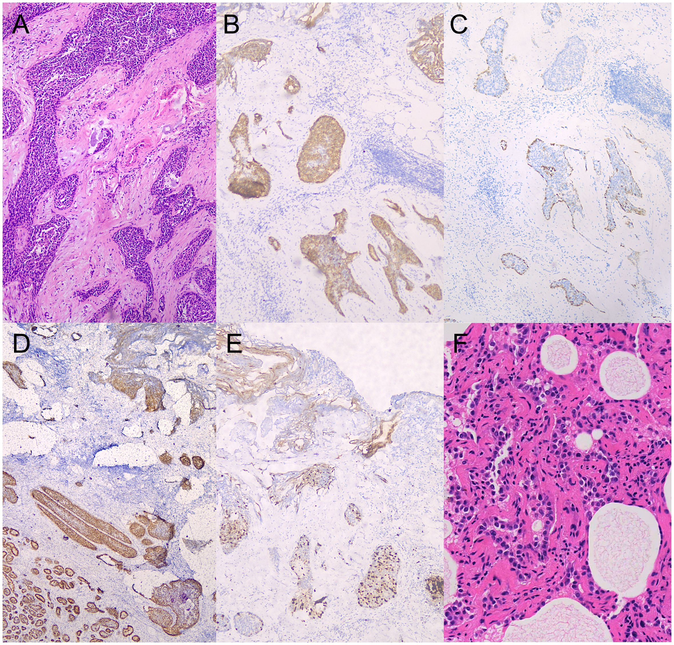 Figure 3. Pathological findings of breast and lung cancer (40× magnification). (A) ductal breast carcinoma in situ (hematoxylin-eosin stain). (B) human epidermal growth factor receptor 2 (HER2/neu) immunohistochemical staining of breast cancer. (C) CK-14 immunohistochemical staining of breast cancer. (D) Estrogen receptor (ER) immunohistochemical staining of breast cancer. (E) Ki-67 proliferation index immunohistochemical staining of breast cancer. (F) lung adenocarcinoma in situ (hematoxylin-eosin stain).