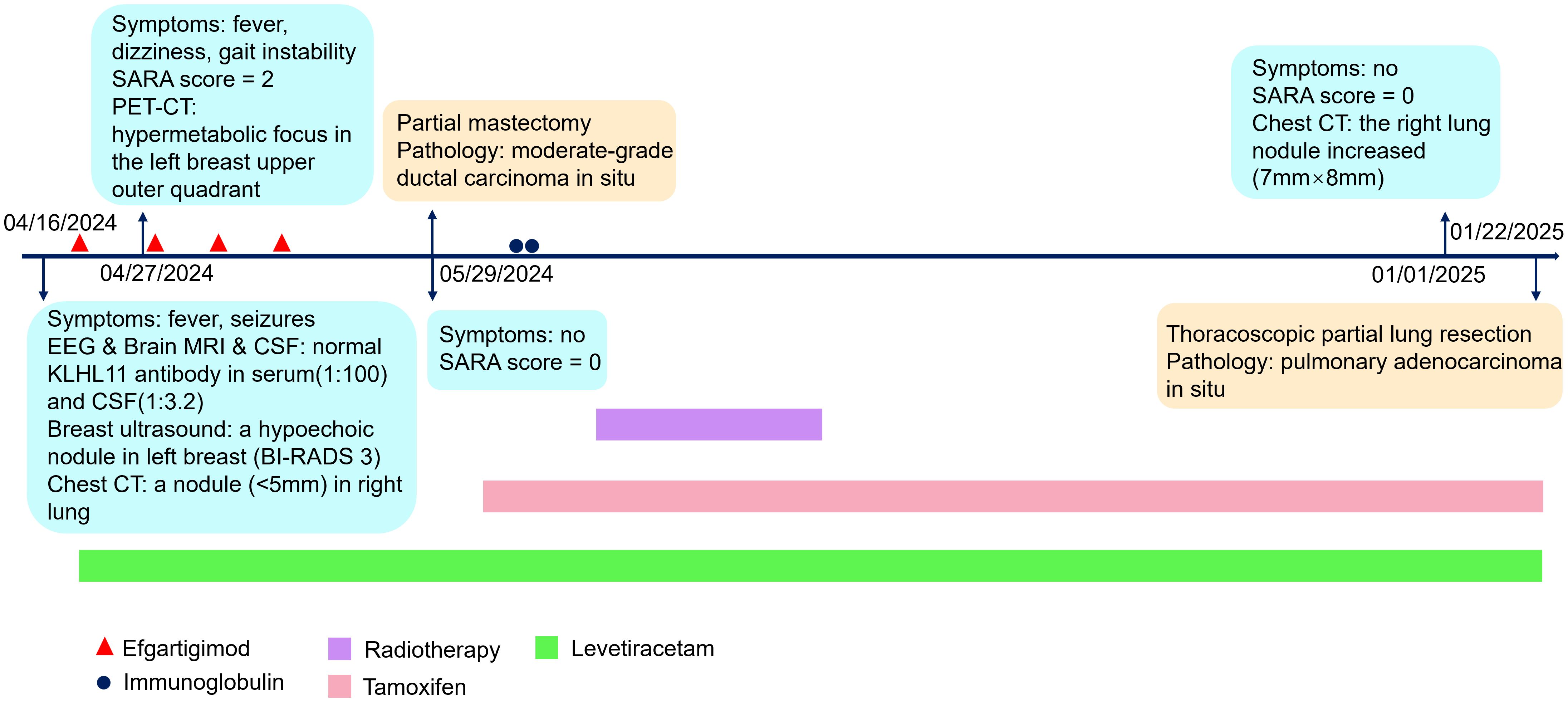 In this case, we reported a female patient presenting with fever, seizures and ataxia. The KLHL11 IgG antibody was positive in serum and CSF. The patient achieved complete symptomatic remission following four weekly infusions of efgartigimod, a neonatal Fc receptor inhibitor (FcRn). Intravenous efgartigimod received its first approval in 2021 for the treatment of generalized myasthenia gravis in adults with positive anti-AChR antibody (3). Efgartigimod effectively reduces the levels of pathogenic IgG, and alleviates T cell activation and the production of systemic pro-inflammatory cytokines (4, 5). The chest computed tomography (CT) revealed a small nodule in the right lung. The whole-body fluorine-18 fluorodeoxyglucose (18F-FDG) positron emission tomography/computed tomography (PET/CT) revealed a hypermetabolic focus in the left breast upper outer quadrant. The patient underwent a partial mastectomy, and postoperative pathology revealed moderate-grade ductal carcinoma in situ. At the 8-month follow-up after disease onset, the patient remained clinically asymptomatic, with serum KLHL11 IgG antibodies still detectable. Additionally, a chest CT scan demonstrated an increase in the size of the right lung nodule with an indistinct border. Thoracoscopic partial lung resection was performed, and the postoperative pathology showed pulmonary adenocarcinoma in situ. The patient had complete symptomatic remission and no recurrence following immunotherapy and tumor resection so far.