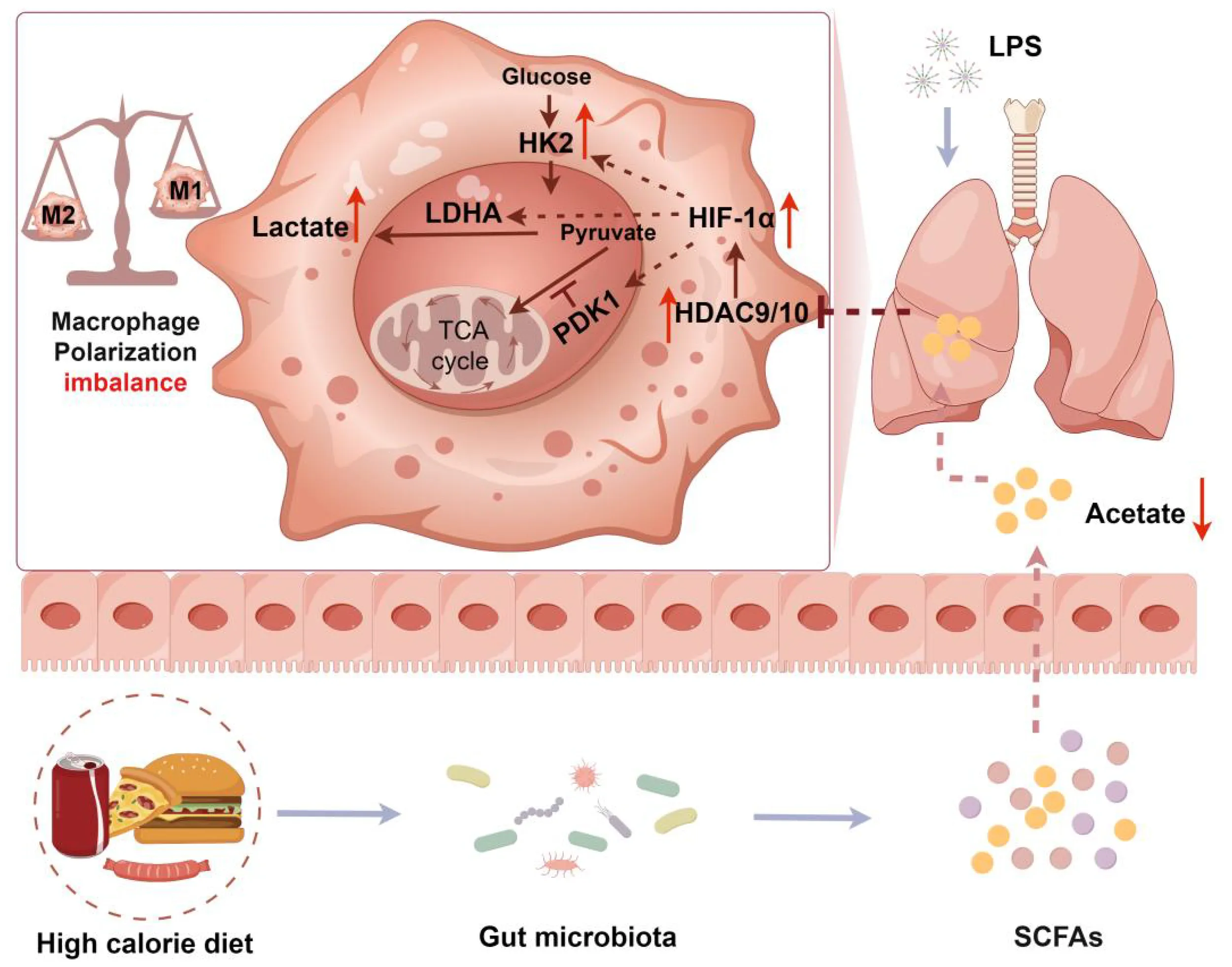 Li Q, Liu H, Bai C, Jiang L, Su C, Qin X, Liu T and Gu X (2025) A high-calorie diet exacerbates lipopolysaccharide-induced pneumonia by promoting acetate-mediated macrophage polarization via the HDAC9/10–HIF-1α–glycolysis axis. Front. Immunol. 16:1614768. doi: 10.3389/fimmu.2025.1614768