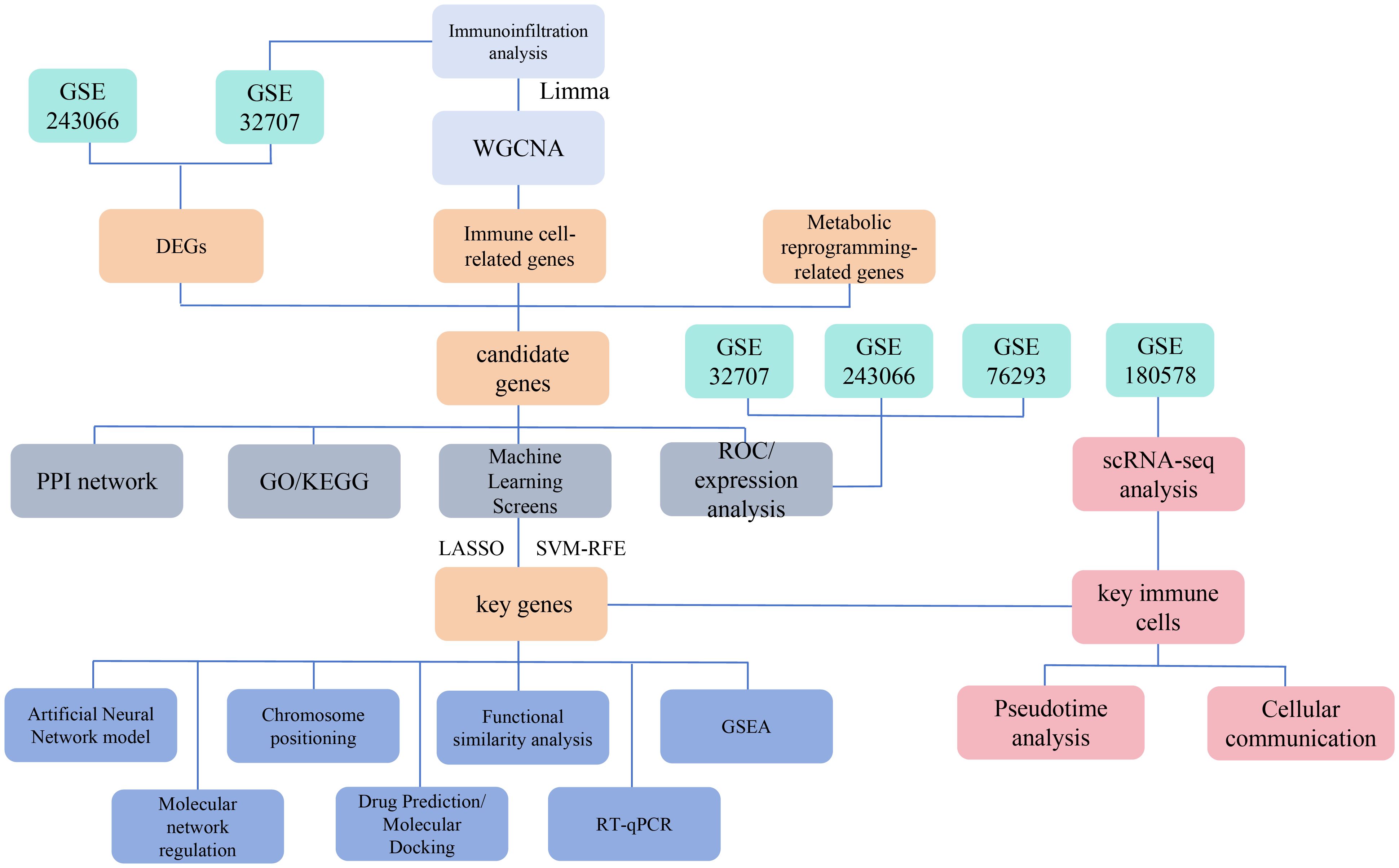 Given the limitations of current treatment strategies, identifying new biomarkers linked to immune cells and metabolic reprogramming is critically important. These biomarkers can enhance our understanding of ARDS pathogenesis and guide the development of targeted therapies. This study aims to identify biomarkers associated with immune cells and metabolic reprogramming in ARDS by integrating transcriptomic data, mechanistic research, and single-cell analysis (5–9). The study flowchart is shown in Figure 1. By examining the complex interplay between immune cell activity and metabolic changes in ARDS, this research has the potential to deepen our understanding of the syndrome and support the implementation of more effective clinical interventions.