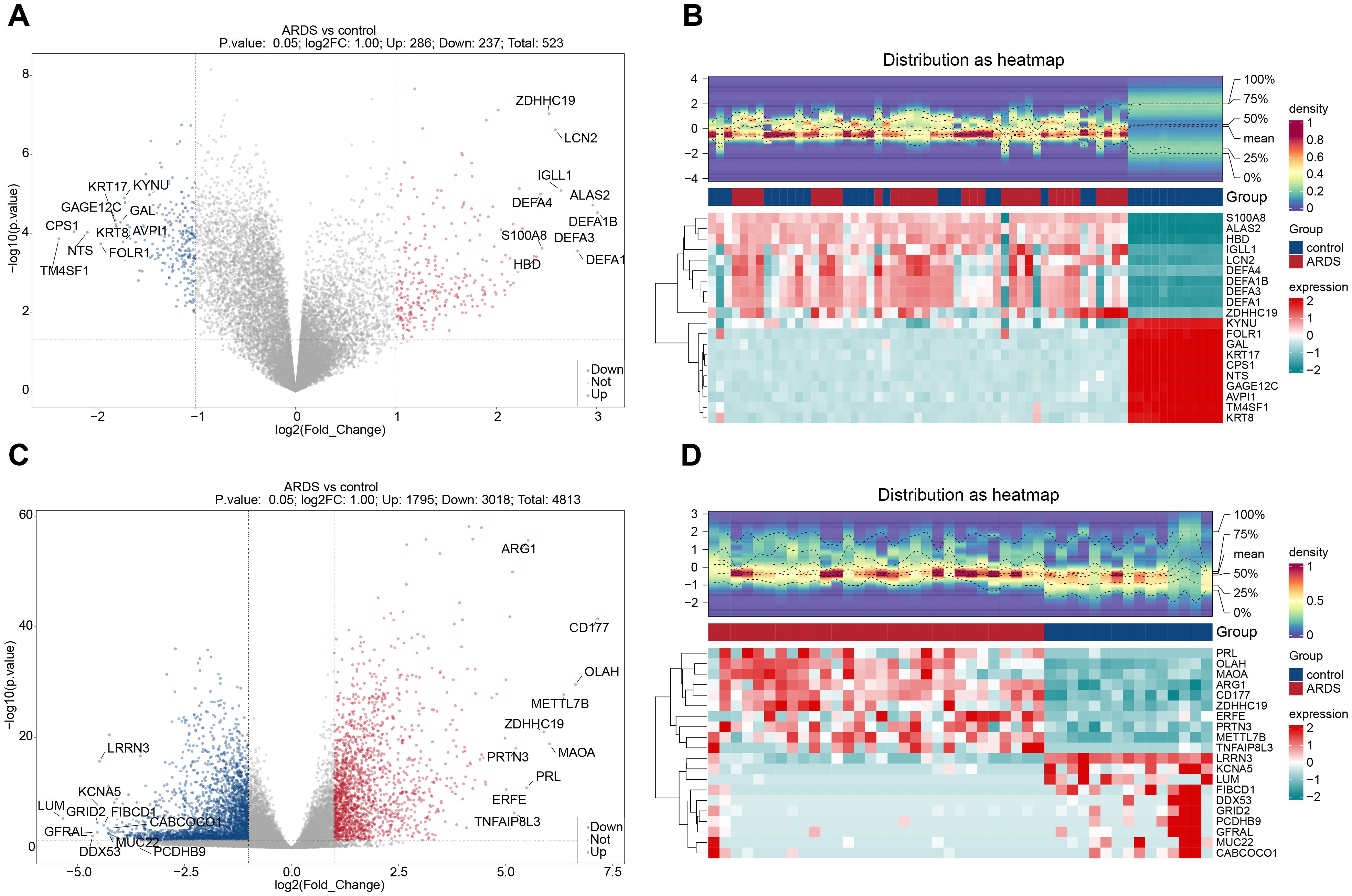 Figure 2. Identification of differentially expressed genes (DEGs) in ARDS. (A) Volcano plot of DEGs in training set 1 (GSE32707). (B) Heatmap of DEGs in training set 1. (C) Volcano plot of DEGs in training set 2 (GSE243066). (D) Heatmap of DEGs in training set 2.