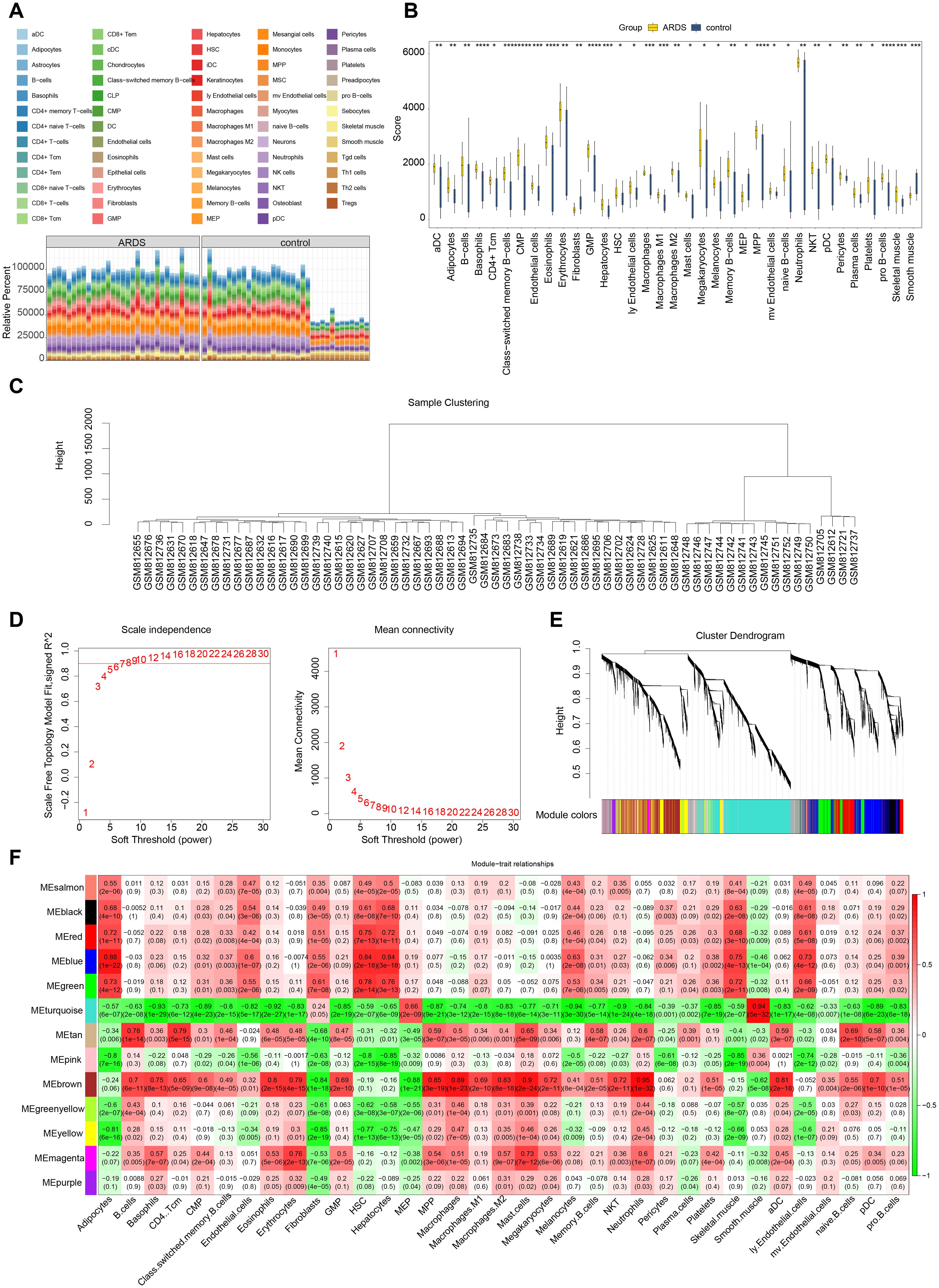 Figure 3. Immune infiltration analysis and weighted gene co-expression network analysis (WGCNA). (A) Analysis of immune cell infiltration. (B) Differential immune cell infiltration analysis. (C) Sample clustering and detection of outliers. (D) Determination of the optimal soft threshold (β). (E) Cluster dendrogram of genes, with different colors below representing different co - expression modules. (F) Heatmap displaying the correlation between gene modules (rows) and cell type proportions (columns), where color intensity indicates the strength of correlation.