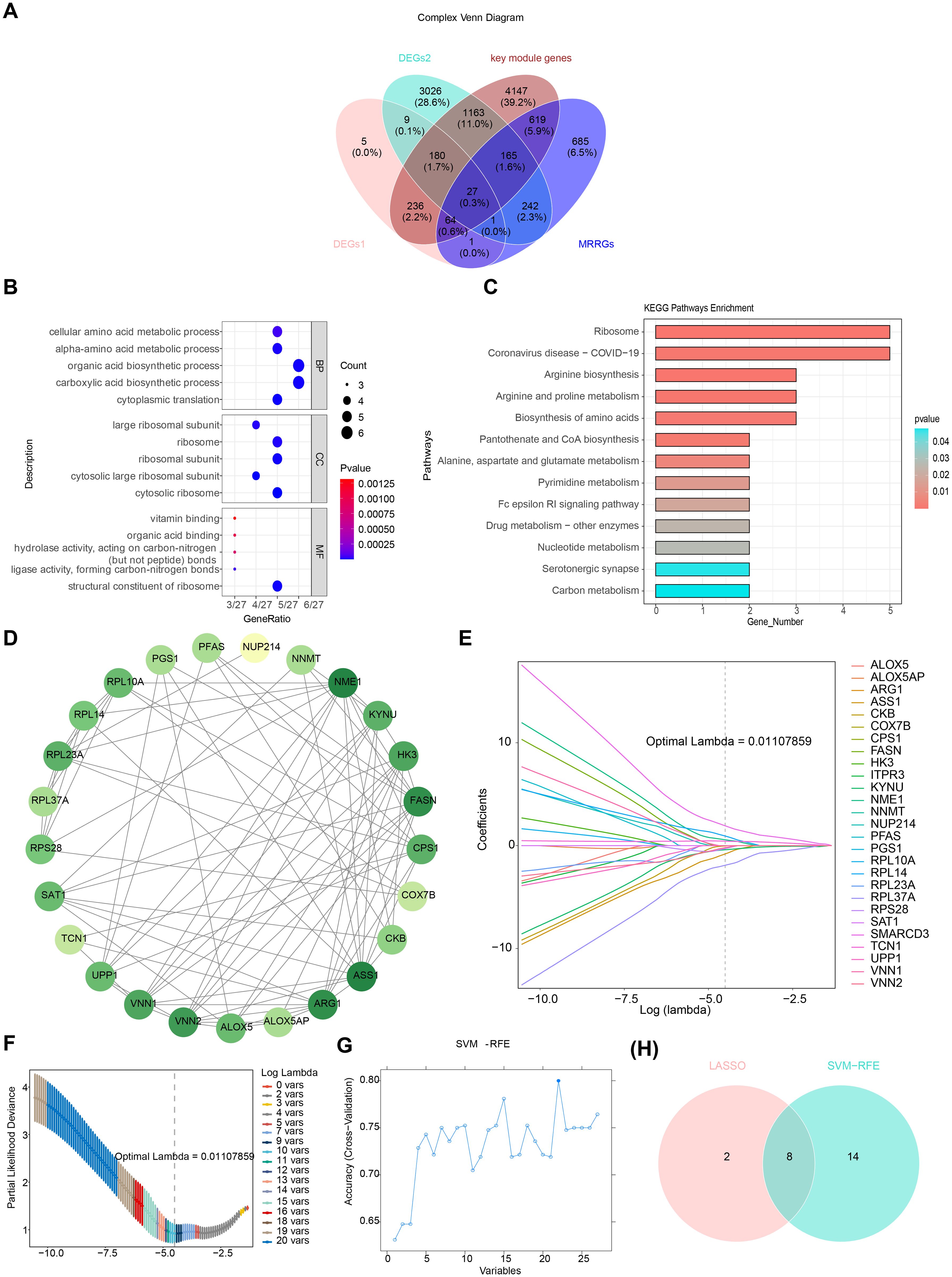 Figure 4. Identification and validation of potential biomarkers in ARDS. (A) Venn diagram of overlapping genes. (B) Gene Ontology (GO) enrichment analysis of 27 candidate genes, highlighting significant enrichment in biological processes such as “structural constituent of ribosome.” (C) Kyoto Encyclopedia of Genes and Genomes (KEGG) enrichment analysis, focusing on pathways related to amino acid biosynthesis and metabolism. (D) Protein-protein interaction (PPI) network of candidate genes, with key genes such as NME1 and ASS1 showing high connectivity. (E) LASSO coefficient profiles for the 10 selected feature genes. (F) Cross-validation for tuning parameter selection in LASSO analysis. (G) SVM-RFE analysis for feature selection. (H) Venn diagram illustrating the overlap of feature genes identified by LASSO and SVM-RFE.