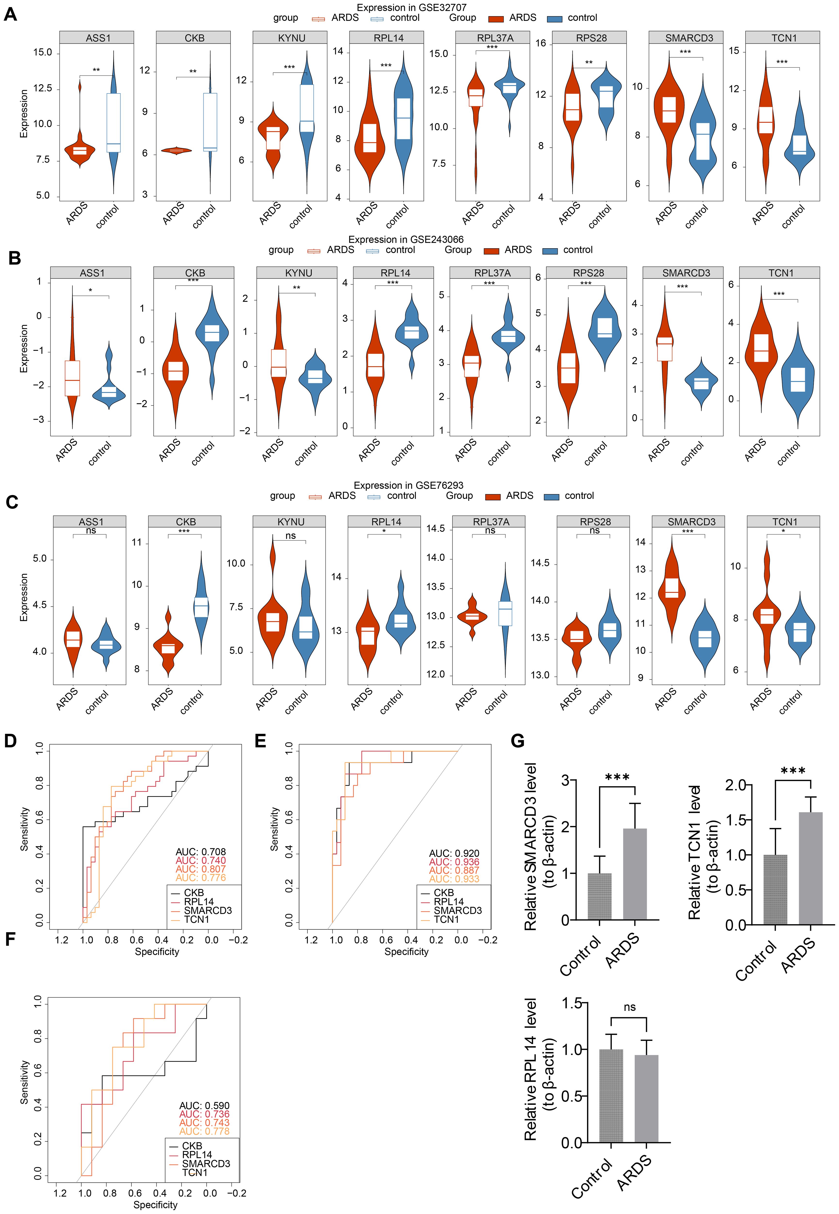 Figure 5. Identification and validation of biomarkers in ARDS. (A-C) Expression analysis of candidate biomarkers. (D-F) ROC curve analysis for the performance of biomarkers. (G) RT-qPCR validation of biomarkers. *p<0.05, **p<0.01, ***p<0.001 vs control group. "ns" indicates no significance.