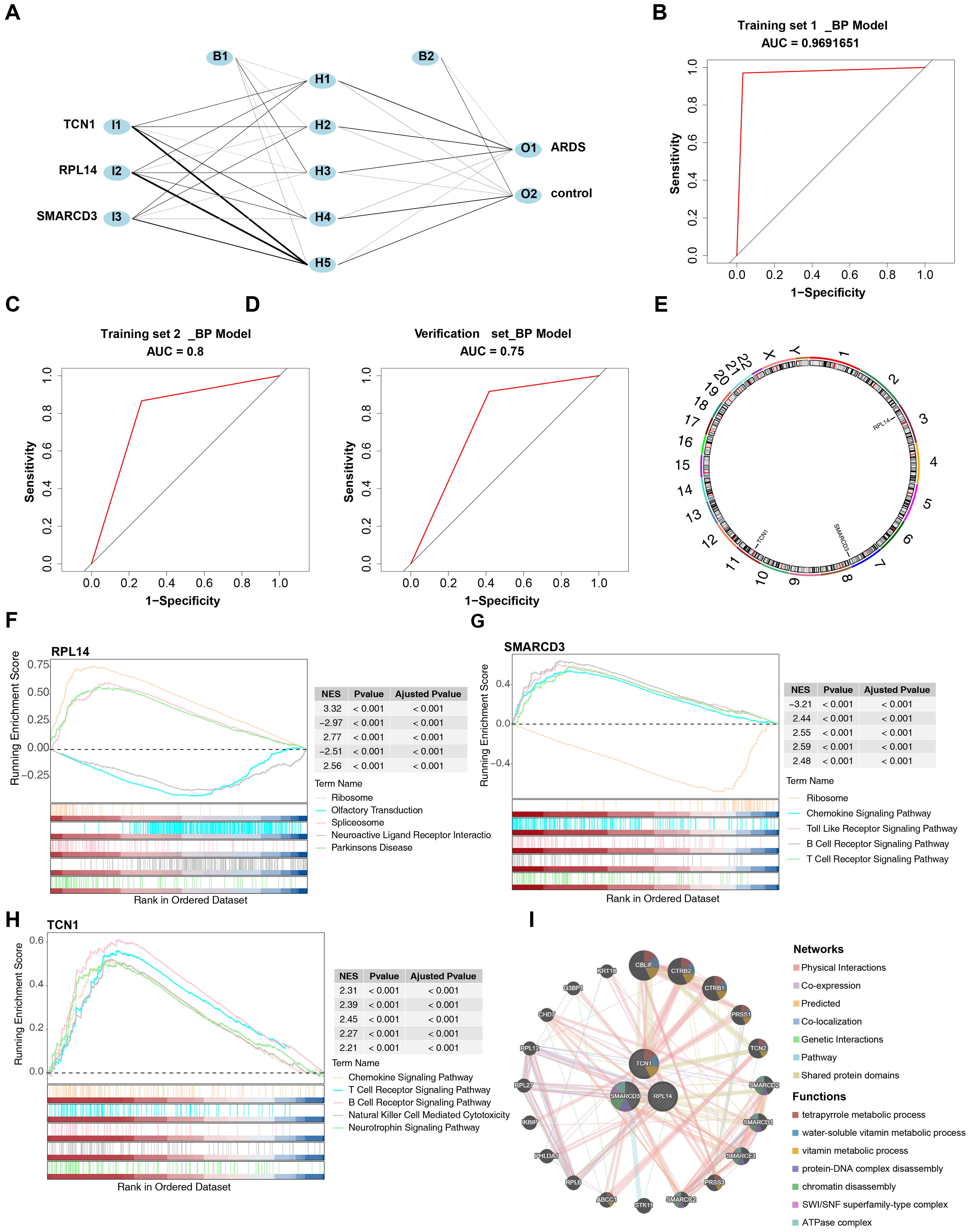 Figure 6. Construction and evaluation of the ANN model and functional enrichment analysis of biomarkers. (A) Architecture of the ANN model. (B-D) ROC curve analysis for the ANN model. (E) Chromosomal localization of biomarkers. (F-H) GSEA of biomarkers. (I) Gene-gene interaction (GGI) network of biomarkers.