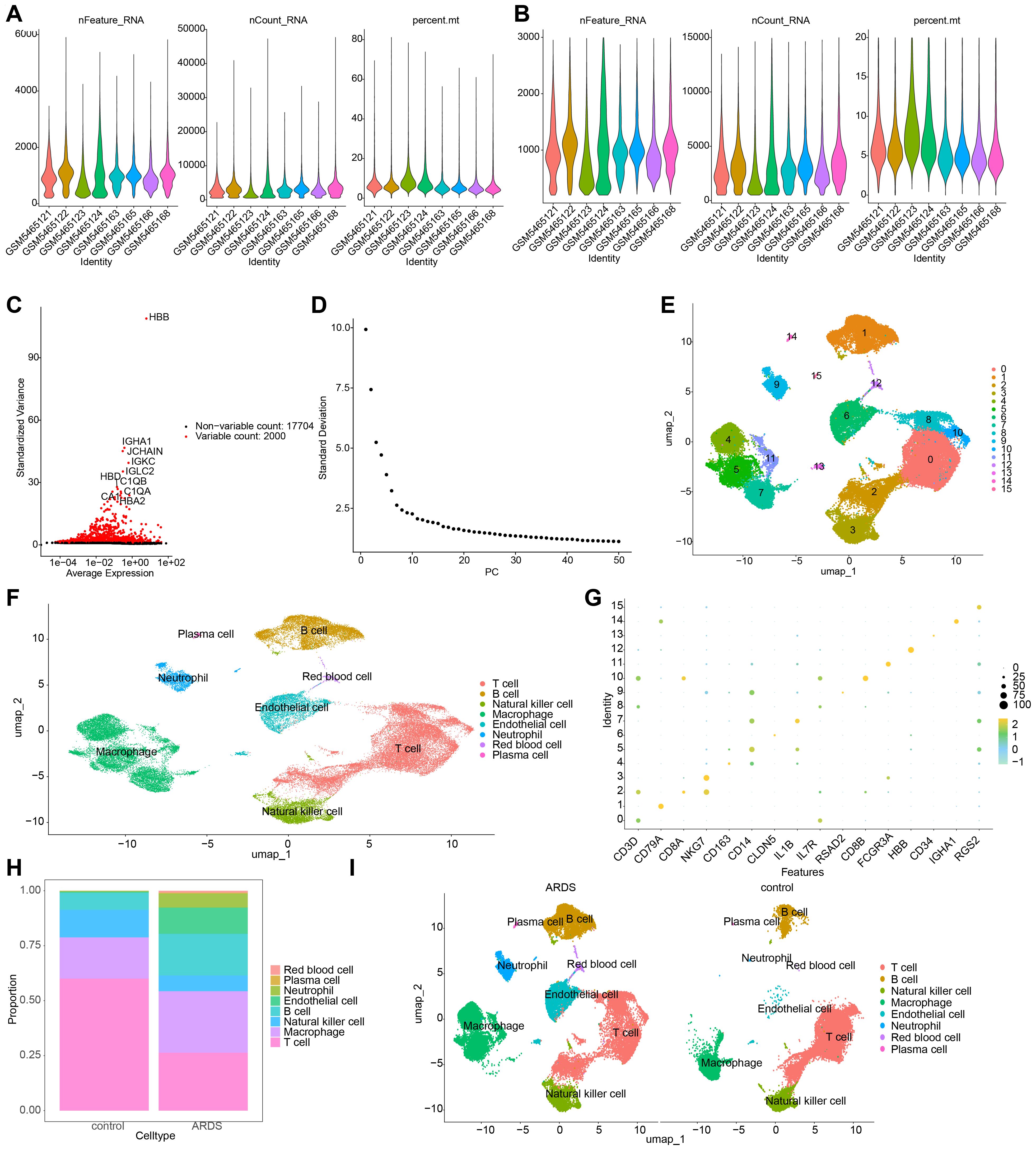 Figure 8. Single-cell RNA sequencing (scRNA-seq) analysis of ARDS samples. (A, B) Number of cells and genes before and after quality control. (C) UMAP plot depicting the top 2,000 highly variable genes (HVGs). (D) Scree plot for principal component analysis (PCA), with the top 30 principal components selected for further analysis. (E) UMAP plot showing the identification of 16 distinct cell clusters. (F) Annotation of 8 major cell types, including B cells, macrophages, and neutrophils. (G) Expression patterns of marker genes across different cell types. (H) Bar plot depicting the proportion of cell types in ARDS and control samples. (I) UMAP plot emphasizing the enrichment of macrophages, endothelial cells, and neutrophils in ARDS samples.