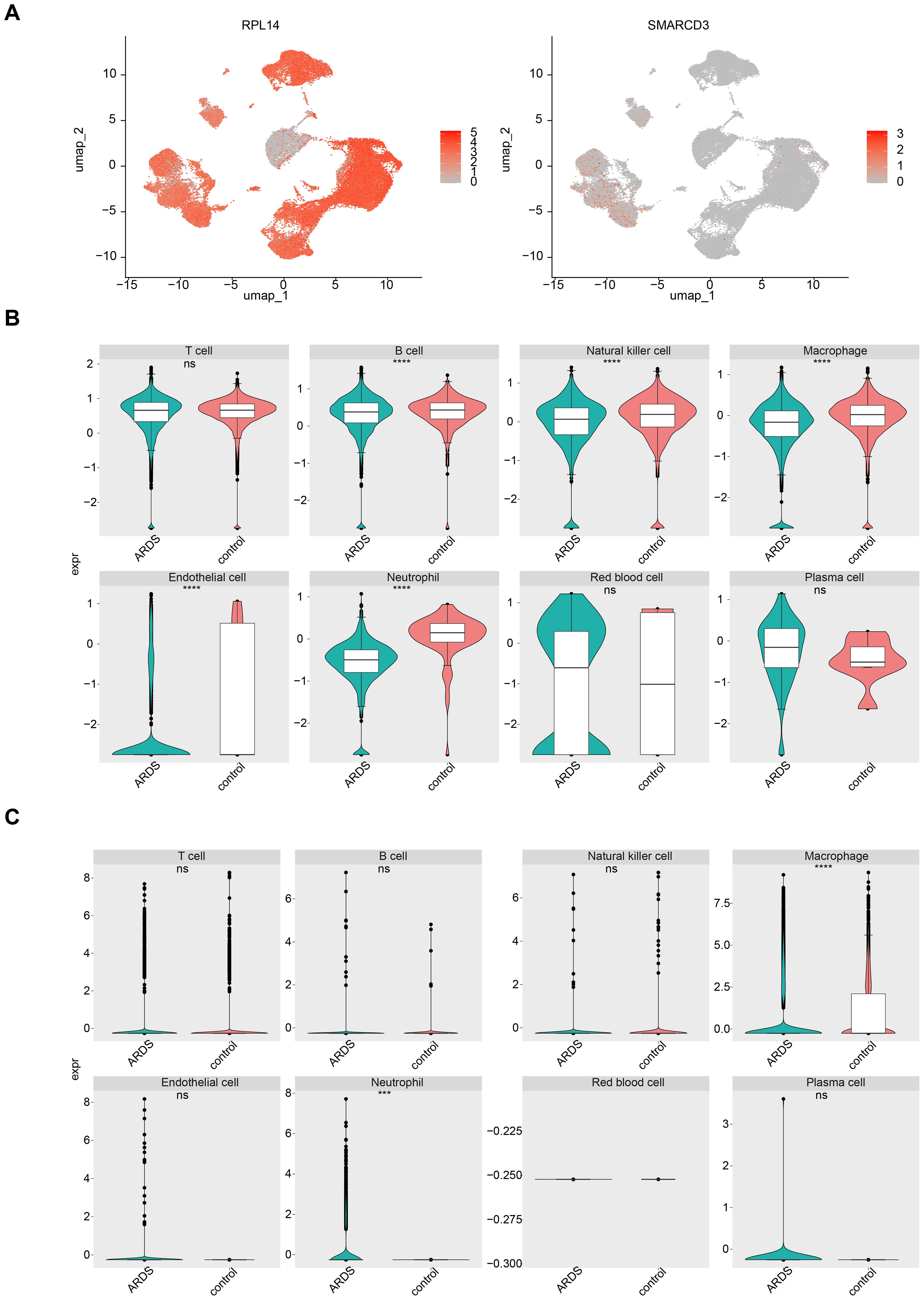 In the GSE180578 dataset, prior to quality control, a total of 57,811 cells and 19,704 genes were identified. After quality control, 53,816 cells and 19,704 genes were retained (Figures 8A, B). The top 2,000 HVGs and the top 30 PCs were then used for UMAP clustering (Figures 8C, D). This process led to the classification of all high-quality cells into 16 distinct clusters (Figure 8E). The cell clusters were annotated, revealing 8 cell types, including B cells, endothelial cells, macrophages, natural killer cells, neutrophils, plasma cells, red blood cells, and T cells (Figure 8F). The marker genes displayed high specificity across different cell clusters (Figure 8G). Notably, T cells comprised the highest proportion among all cell types. A comparison between ARDS and control samples revealed that macrophages, endothelial cells, and neutrophils were significantly more abundant in ARDS samples (Figures 8H, I).
