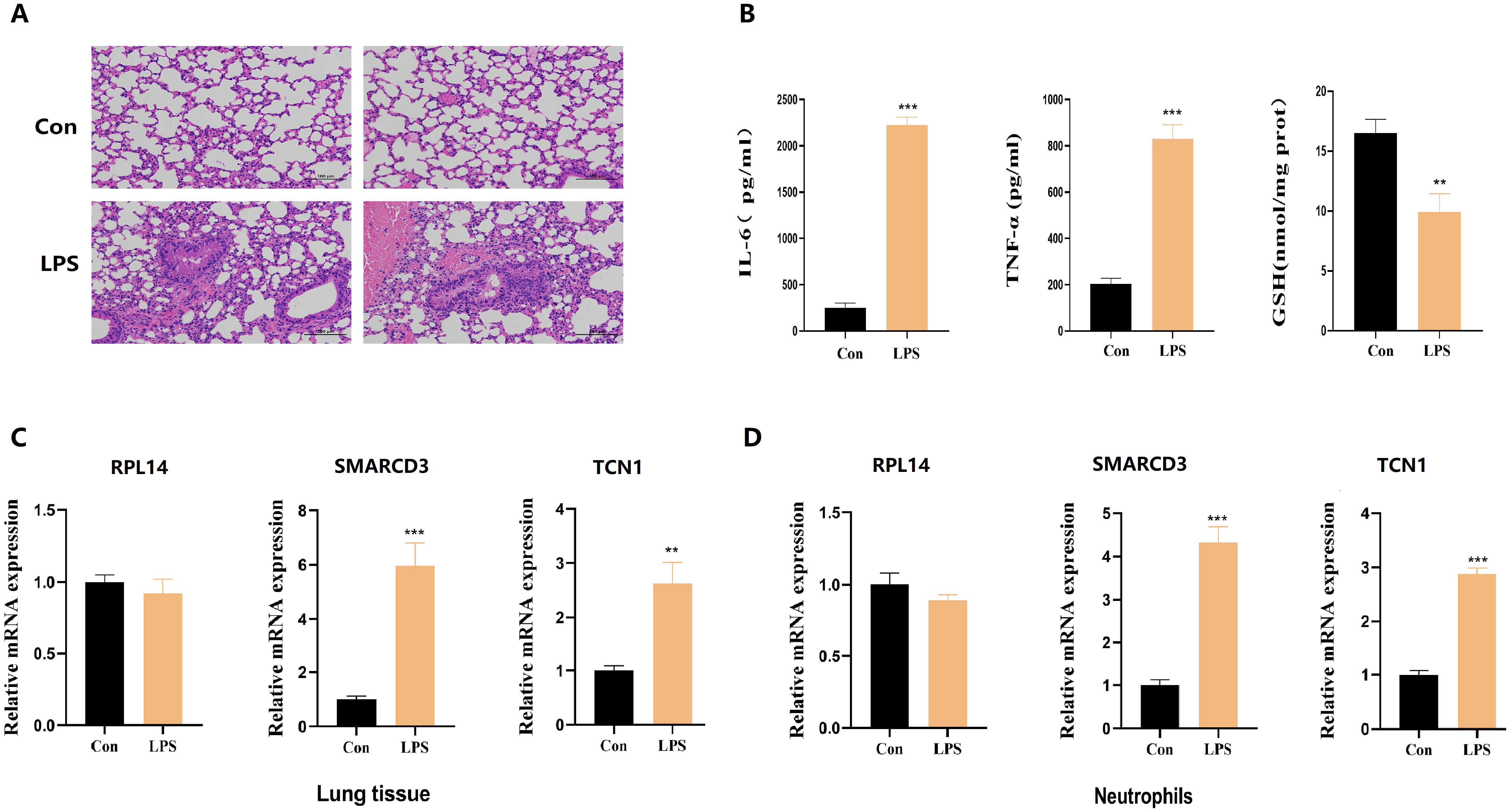C57BL/6 male mice (8–12 weeks old, 18–22 g) were purchased from Jiangsu Huachuang Xinnuo Pharmaceutical Technology Co., Ltd. (Taizhou, China) and were housed under specific pathogen-free conditions. All animal procedures were approved by the Institutional Animal Care and Use Committee of Southeast University (Approval No.SEU-20252018005).Mice were randomly divided into two groups: LPS group, mice were administered with LPS nasal instillation at a dose of 10 mg/kg(50ul); Control group, mice received an equal amount of saline. After 24 h, all mice were anesthetized and sacrificed. Blood samples were collected for subsequent neutrophils isolation. Lung tissues were harvested and divided into three portions: one was fixed in formalin for histological sectioning and HE staining, one was homogenized for cytokine analysis by Enzyme-Linked Immunosorbent Assay (ELISA), and the remainder was stored at -80°C for RT-qPCR analysis.RPL14, SMARCD3, and TCN1 mRNA expression in peripheral blood neutrophils and lung tissues was analyzed by RT-qPCR. Levels of glutathione (GSH), IL-6, and TNF-α in lung tissue homogenates were measured by ELISA.