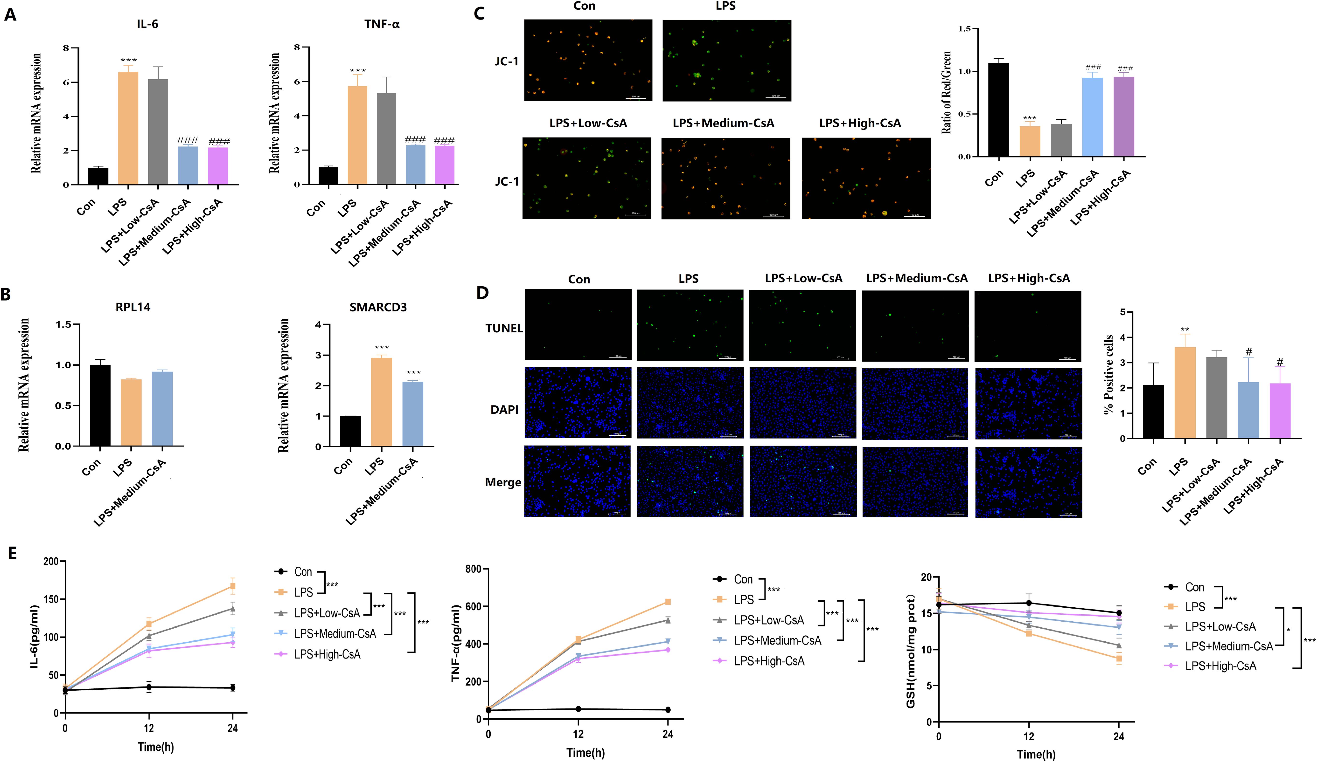 Induction of THP-1 cell differentiation into macrophages via PMA treatment and then a macrophage inflammatory model was constructed by LPS. Different concentrations of CsA were applied to the macrophages, which was divided into three groups: low concentration group (2μM), medium concentration group (4μM) and high concentration group(8μM). RT-qPCR was performed to measure the mRNA expression levels of IL-6 and TNF-α in each group. RPL14,SMARCD3 and TCN1 mRNA expression also was detected by RT-qPCR. Cells from the above groups were further assessed for mitochondrial function by JC-1 staining, oxidative stress by ROS detection, apoptosis by TUNEL staining assay and inflammatory markers (TNF-α, IL-6, GSH) via ELISA.