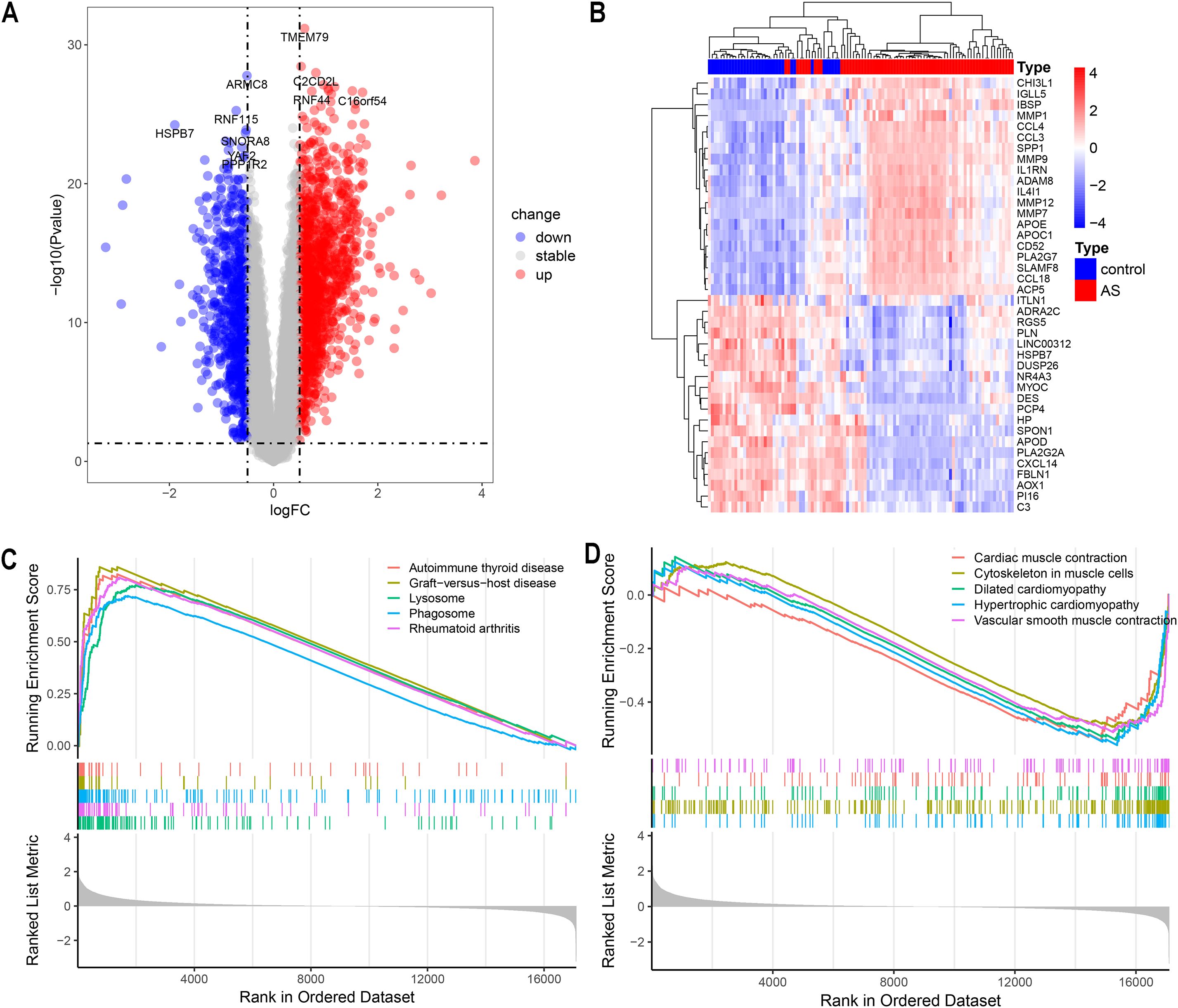Figure 2. Analysis of Differentially Expressed Genes (DEGs). (A) Volcano plot showing up/down-regulated DEGs of the AS vs. control groups in the GSE100927 dataset. (B) Heatmap depicting DEGs expression patterns in the GSE100927 dataset. (C, D) Gene set enrichment analysis (GSEA) reveals the principal upregulated and downregulated pathways from the KEGG database in the GSE100927 dataset.