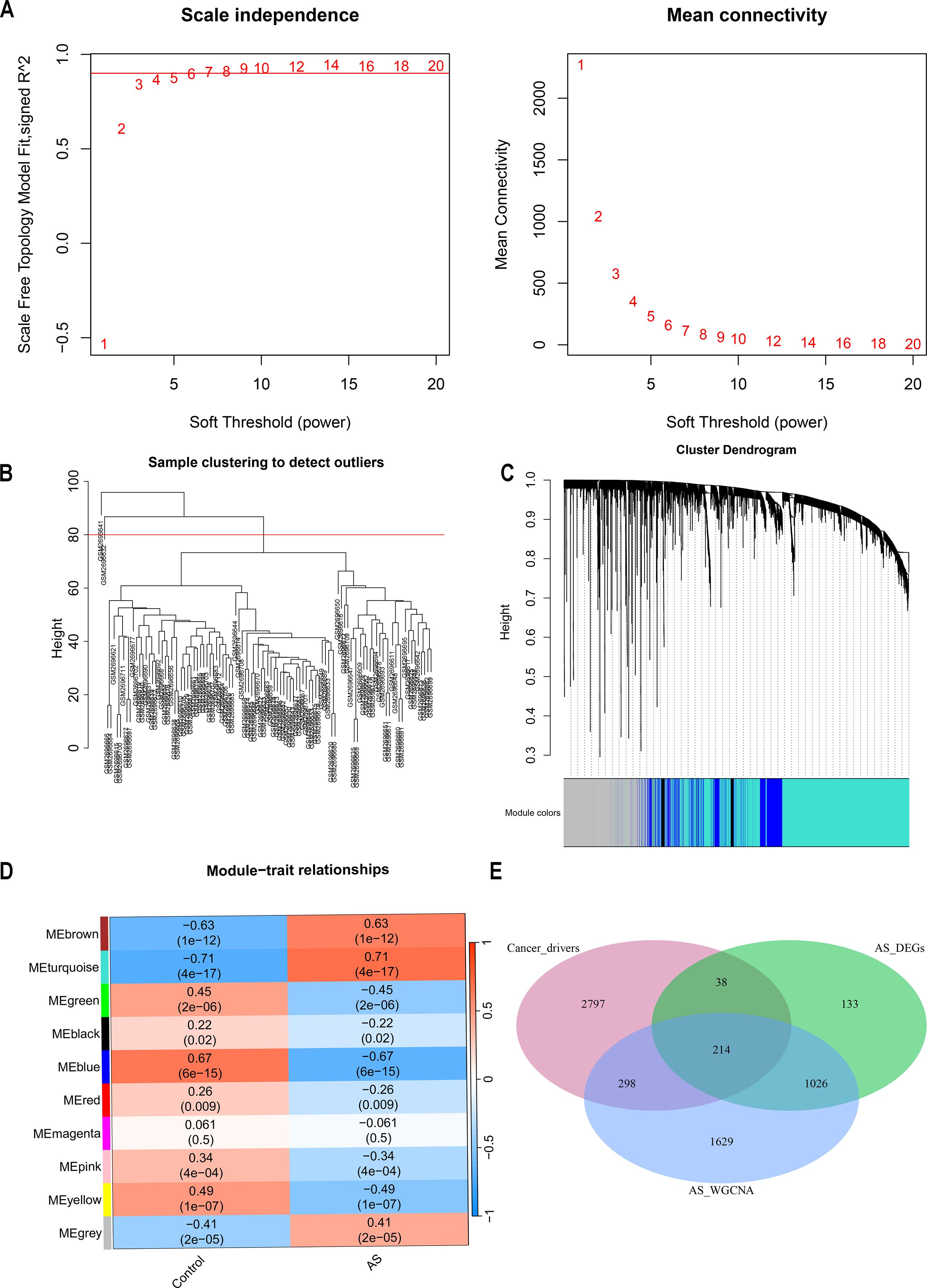 Figure 3. Enrichment levels in the weighted gene coexpression network analysis (WGCNA) of the genome. (A) Soft threshold β = 14 and scale-free topological fit index ­(R2). (B) Each leaf represents a unique sample, and the red line indicates the height threshold for outlier detection. (C) the hierarchical clustering of gene modules. (D) Heat map of module-trait correlations. (E) Venn Diagram of cancer drivers, AS differentially expressed genes (DEGs), versus genes identified in AS WGCNA.