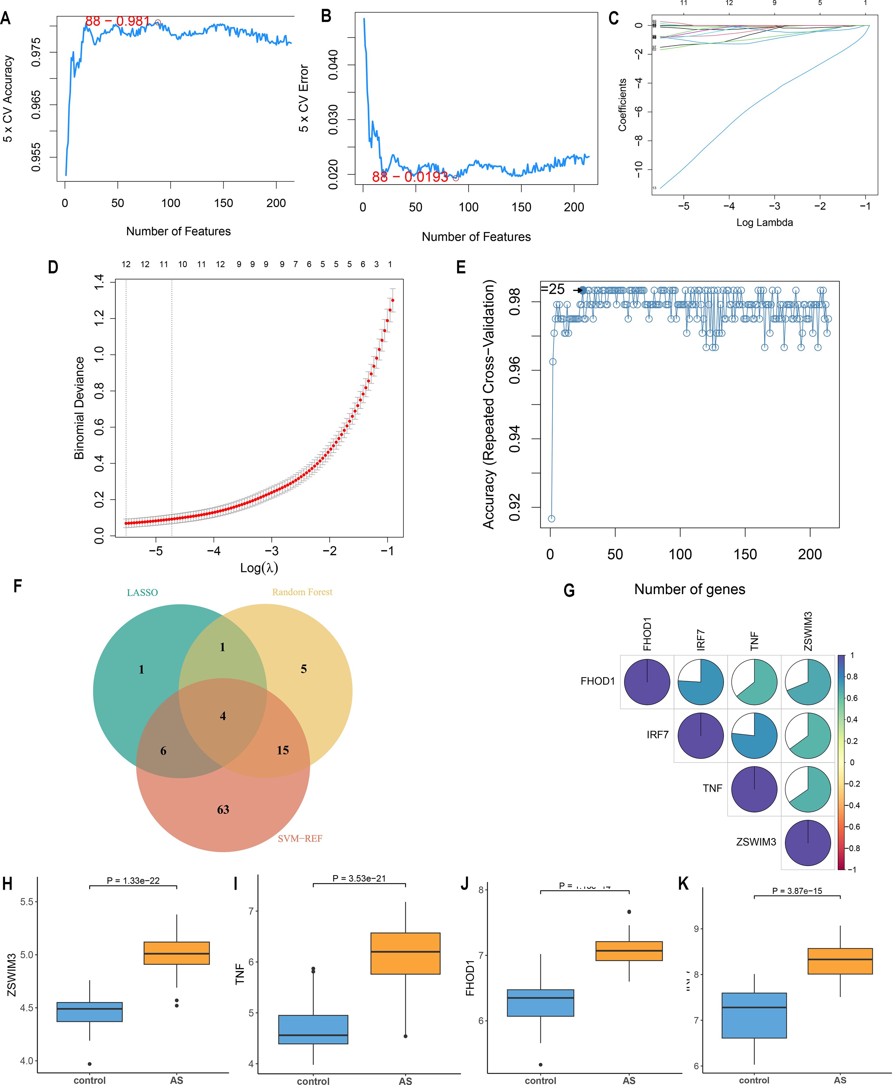 Figure 4. Feature gene selection. (A, B) Signature gene expression was screened based on the support vector machine recursive feature elimination (SVM-RFE) algorithm. (C, D) Adjusting feature selection using the least absolute shrinkage and selection operator (LASSO) algorithm. (E) Random forest error rate versus the number of classified trees. (F) Venn diagram of the four hub genes obtained from the intersection of results from SVM-RFE, RF, and LASSO algorithms (G) Correlation between hub genes. (H-K) Expression of four hub genes in AS and control groups.