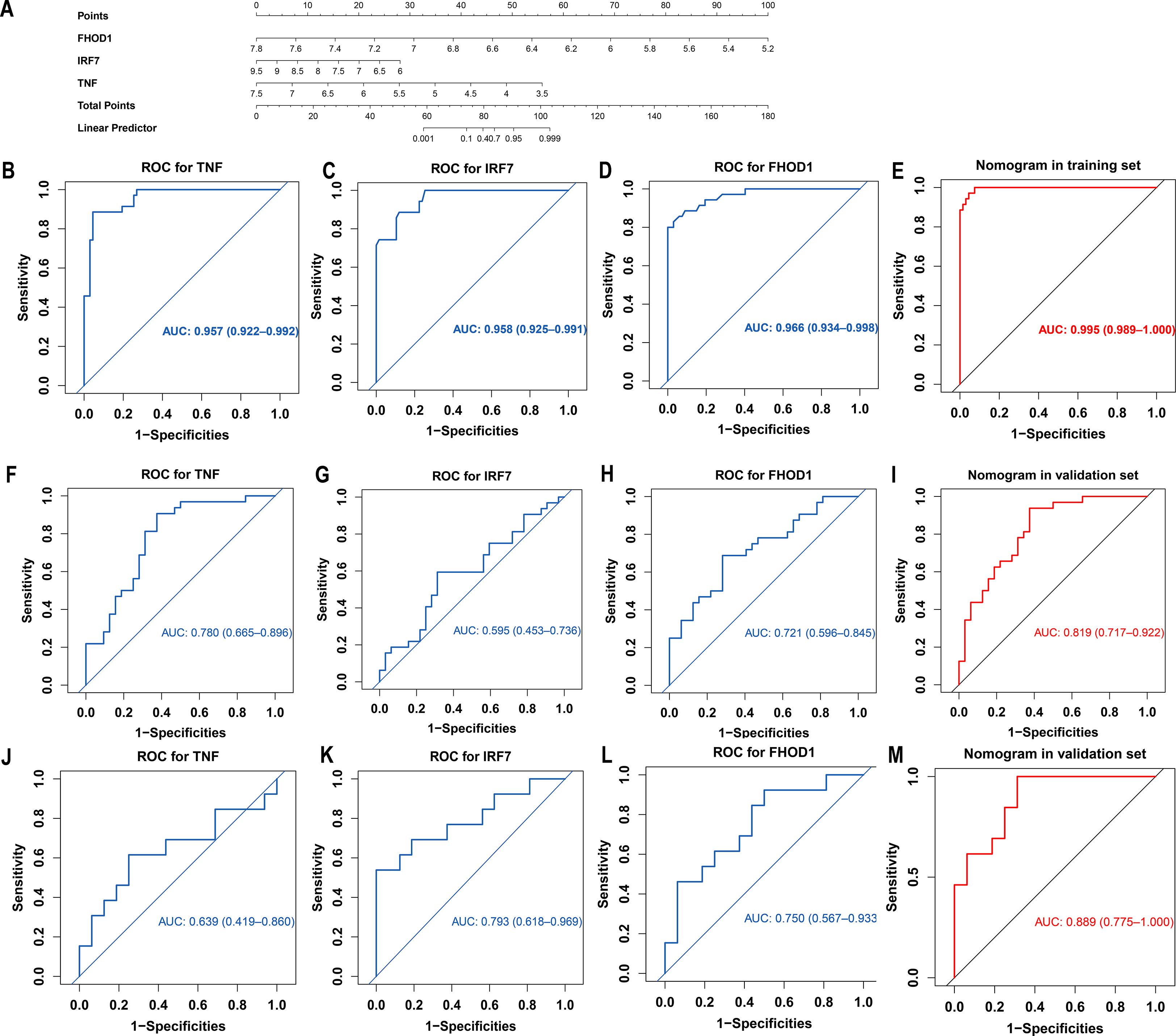 A composite image displaying multiple Receiver Operating Characteristic (ROC) curves and a nomogram. Panels A to M include ROC curves for TNF, IRF7, and FHOD1 genes, showing sensitivity against one minus specificity. Each graph indicates the Area Under the Curve (AUC) with confidence intervals. The nomogram plots in panels E and I-M assess training and validation sets, highlighting predictive power. AUC values range from 0.559 to 0.995, indicating varying levels of performance.