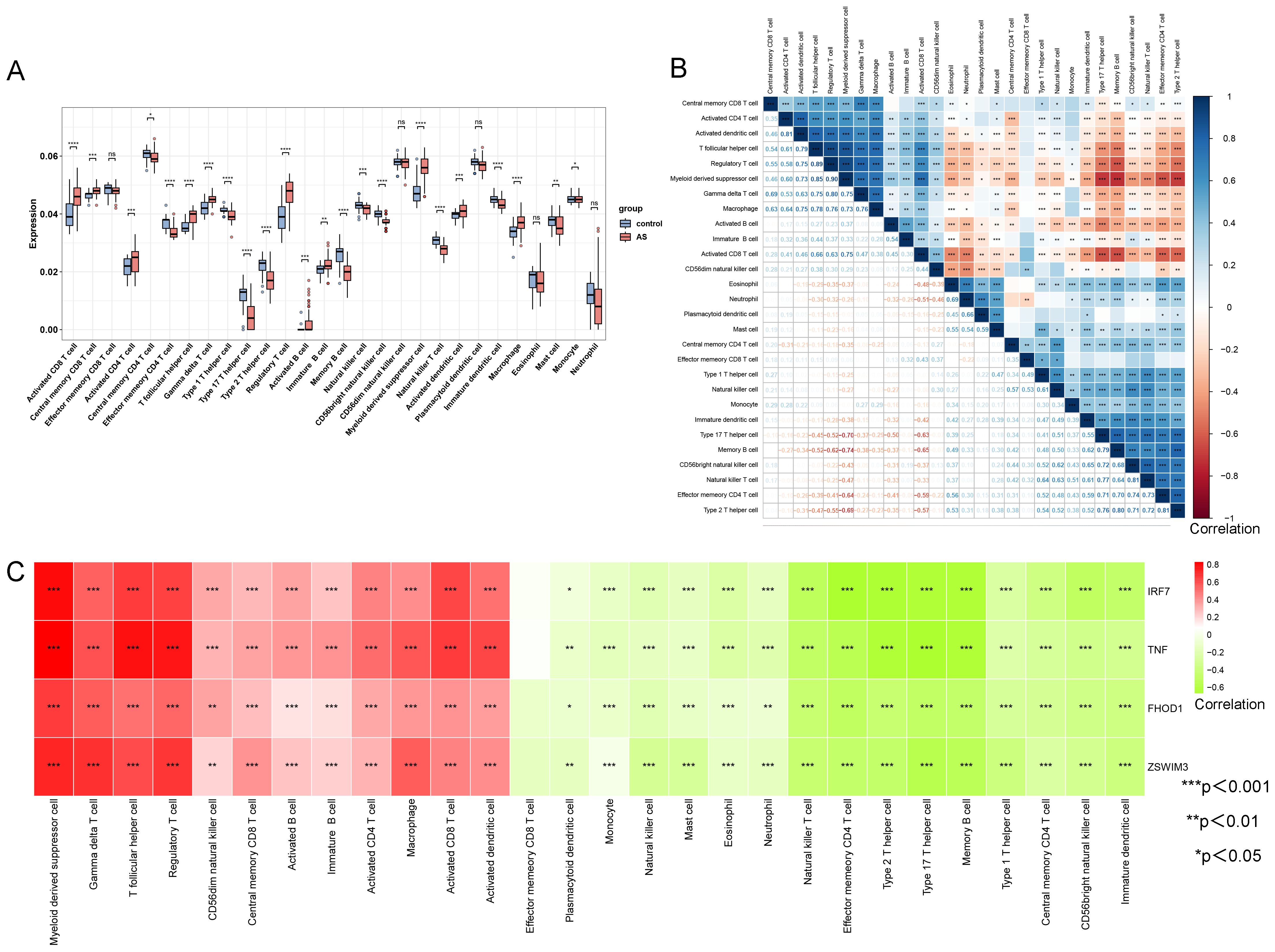 Figure 6. Comparison of immune cell type infiltration between AS and controls (GSE100927 dataset) assessed by ssGSEA. (A) Boxplot illustrating the proportions of immune cells. (B) Correlation matrix of immune cell proportions. *p < 0.05, **p < 0.01, ***p < 0.001. (C) Correlation analysis between hub genes and immune cells.
