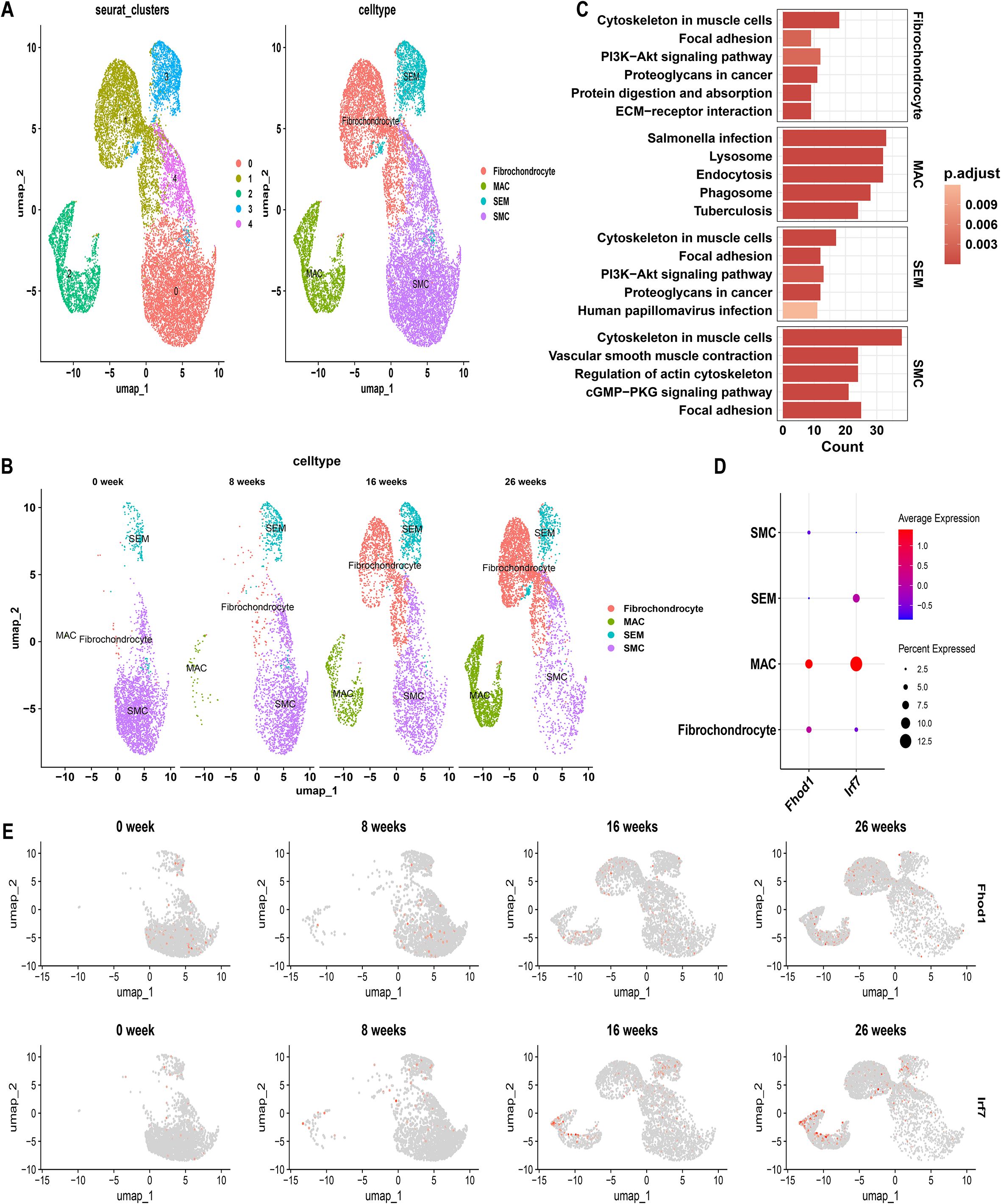 Figure 7. Single-cell genomics with SMC-Lineage Tracing: Normalized Data Comparison. (A) Unified manifold approximation and projection (UMAP) clustering into 5 clusters, and Cells were annotated using CellMarker and singleR. (B) UMAP visualization illustrating the dynamic changes in cellular populations over a 26-week period. (C) KEGG pathway enrichment in different VSMC subtypes. (D) Feature Plots showing the expression pattern of FHOD1 and IRF7 over a 26-week period. (E) Dot plot shows the expression levels of FHOD1 and IRF7 in each cell cluster.