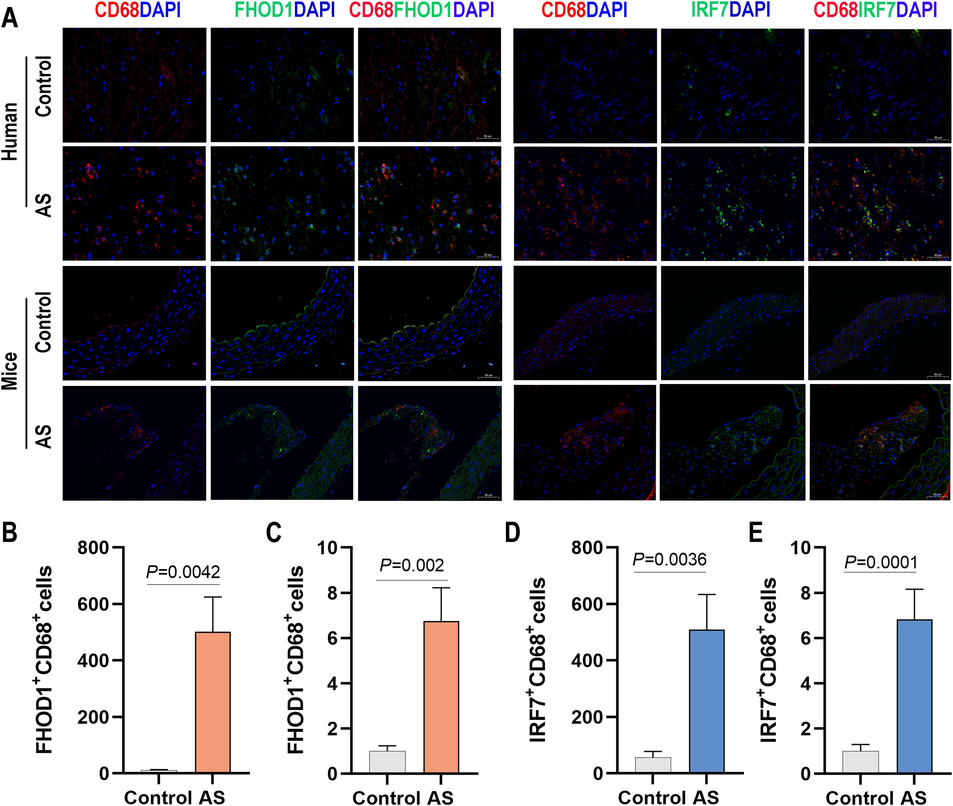 Paraffin-embedded tissue sections of human and mouse arterial tissues were prepared for immunofluorescence staining. The sections were deparaffinized, rehydrated, and subjected to antigen retrieval before staining. Samples were incubated overnight at 4°C with primary antibodies, including IRF7 (1:50; Cat# 22392-1-AP; Proteintech) and FHOD1 (1:50; Cat# PC13158s; Abmart). Primary antibody binding was detected using a CoraLite®488-conjugated goat anti-rabbit IgG secondary antibody (1:1000; Cat# ab150081; Abcam). For colocalization studies, sections were costained with a CD68 primary antibody (1:50; Cat# E-AB-22013; Elabscience), followed by detection with an Alexa Fluor® 594-conjugated goat anti-mouse IgG secondary antibody (1:1000; Cat# ab150120; Abcam).Nuclei were counterstained with Fluoroshield containing 4′, 6-diamidino-2-phenylindole (DAPI; Cat# F6057; Sigma, USA). Fluorescent images were captured using the Nikon A1R HD25 confocal microscope system (Nikon, Japan). Image processing and fluorescence quantification were performed using Fiji (ImageJ).