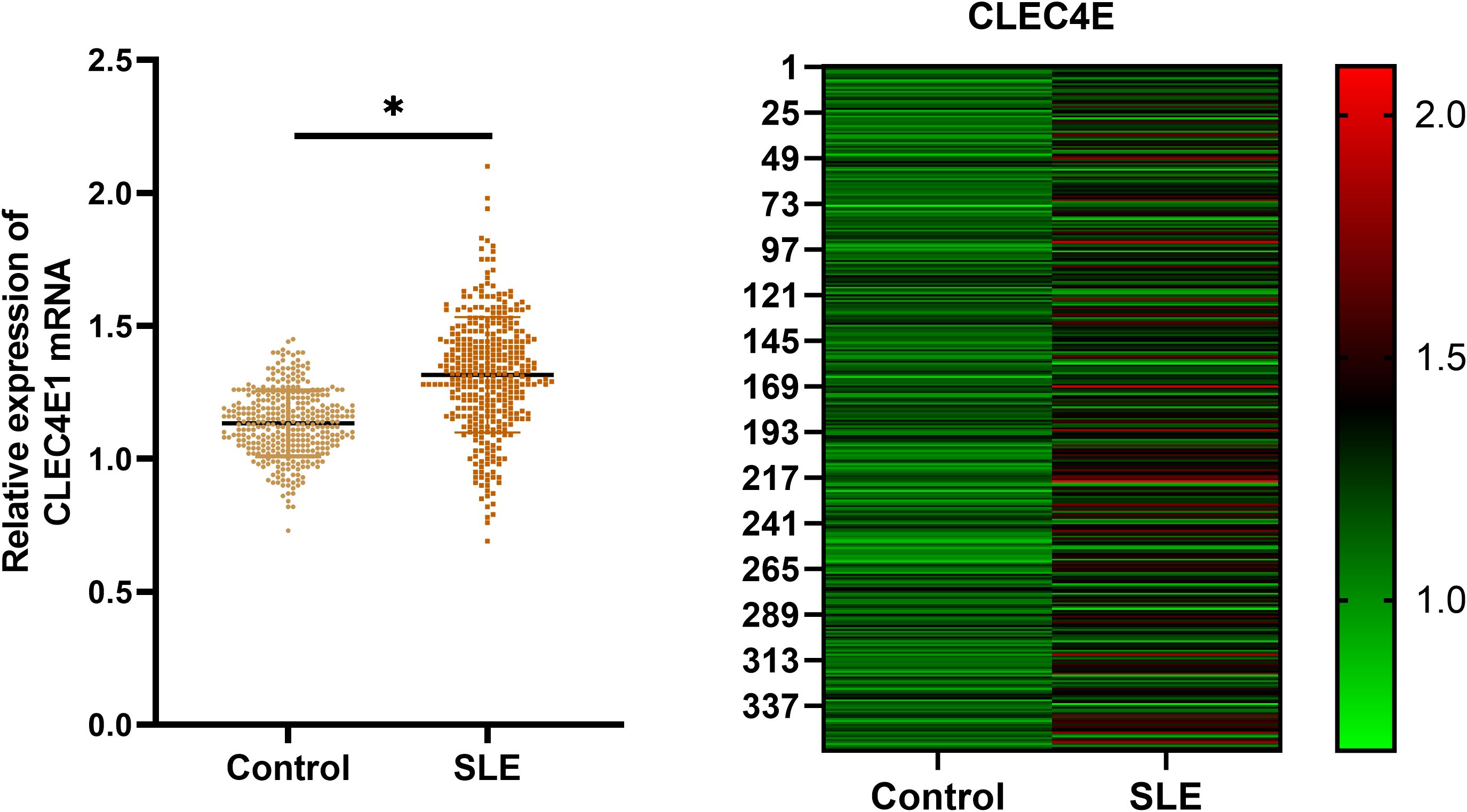 Figure 2. Expression of CLEC4E in healthy controls and SLE patients. The symbol * indicates a statistically significant difference between the two groups (*P < 0.05).