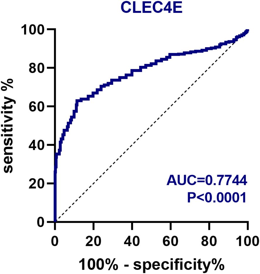 The diagnostic value of CLEC4E in SLE patients was assessed using ROC curve analysis. The AUC for CLEC4E was 0.7744, with a sensitivity of 63.06% and a specificity of 86.39%, indicating that CLEC4E has high diagnostic performance for SLE. See Table 3 and Figure 3.