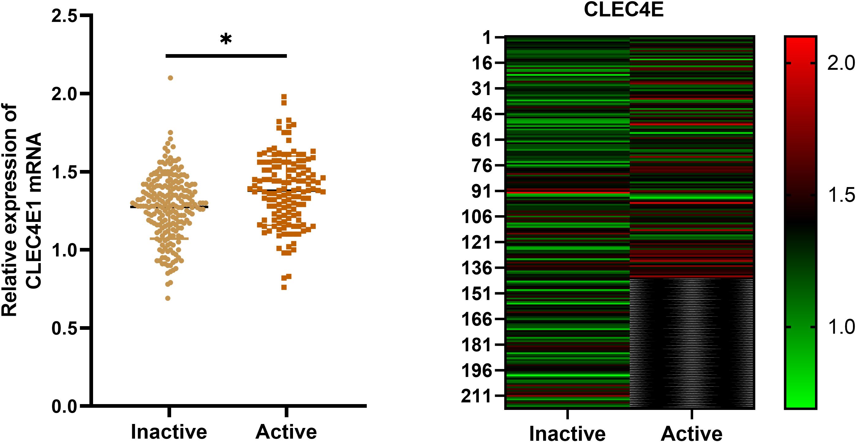 Figure 5. Expression of CLEC4E in SLE patients with different disease activity. The symbol * indicates a statistically significant difference between the two groups (*P < 0.05).
