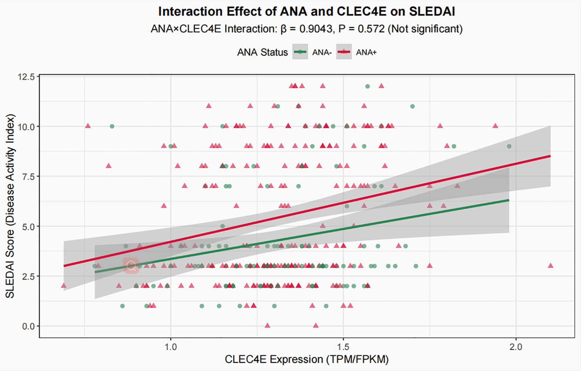 To explore the potential interaction between CLEC4E expression and ANA status, an interaction term (ANA × CLEC4E) was added to the aforementioned multivariate model. The analysis showed that the regression coefficient of the interaction term was 0.9043 with a P value of 0.572, indicating that the effect of CLEC4E on disease activity (SLEDAI) did not differ significantly between ANA-positive and ANA-negative patients (Figure 6). Therefore, the interaction term was not included in the main-effect model, and subsequent analyses and conclusions were based on the multivariate model without the interaction term.