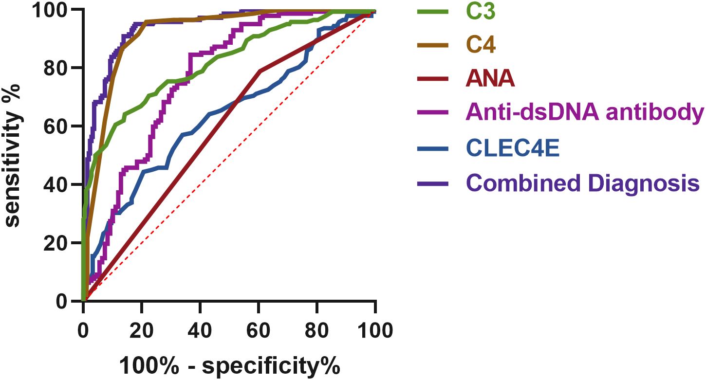 The diagnostic value of CLEC4E in different disease activity phases of SLE was evaluated using ROC curve analysis. The results showed that CLEC4E had an AUC of 0.6360, a sensitivity of 44.37%, and a specificity of 79.36%, indicating its potential diagnostic value in assessing SLE activity, particularly in distinguishing patients with high specificity. Although CLEC4E’s standalone diagnostic performance has certain limitations, its diagnostic capacity significantly improves when combined with other markers (such as C3, C4, ANA, and anti-dsDNA antibodies). The combined diagnostic performance showed a remarkable AUC of 0.9407, with a sensitivity of 95.07% and a specificity of 82.11%, further highlighting CLEC4E’s potential in SLE diagnosis, especially when used in conjunction with multiple biomarkers. See Table 6 and Figure 6. See Table 9 and Figure 7.