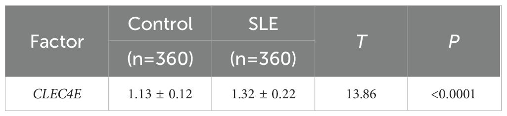 The expression of the CLEC4E gene was detected in both the SLE patient group and the healthy control group using RT-qPCR. The results indicated that CLEC4E expression was significantly elevated in the SLE group relative to the control group (P< 0.05). See Table 2 and Figure 2.