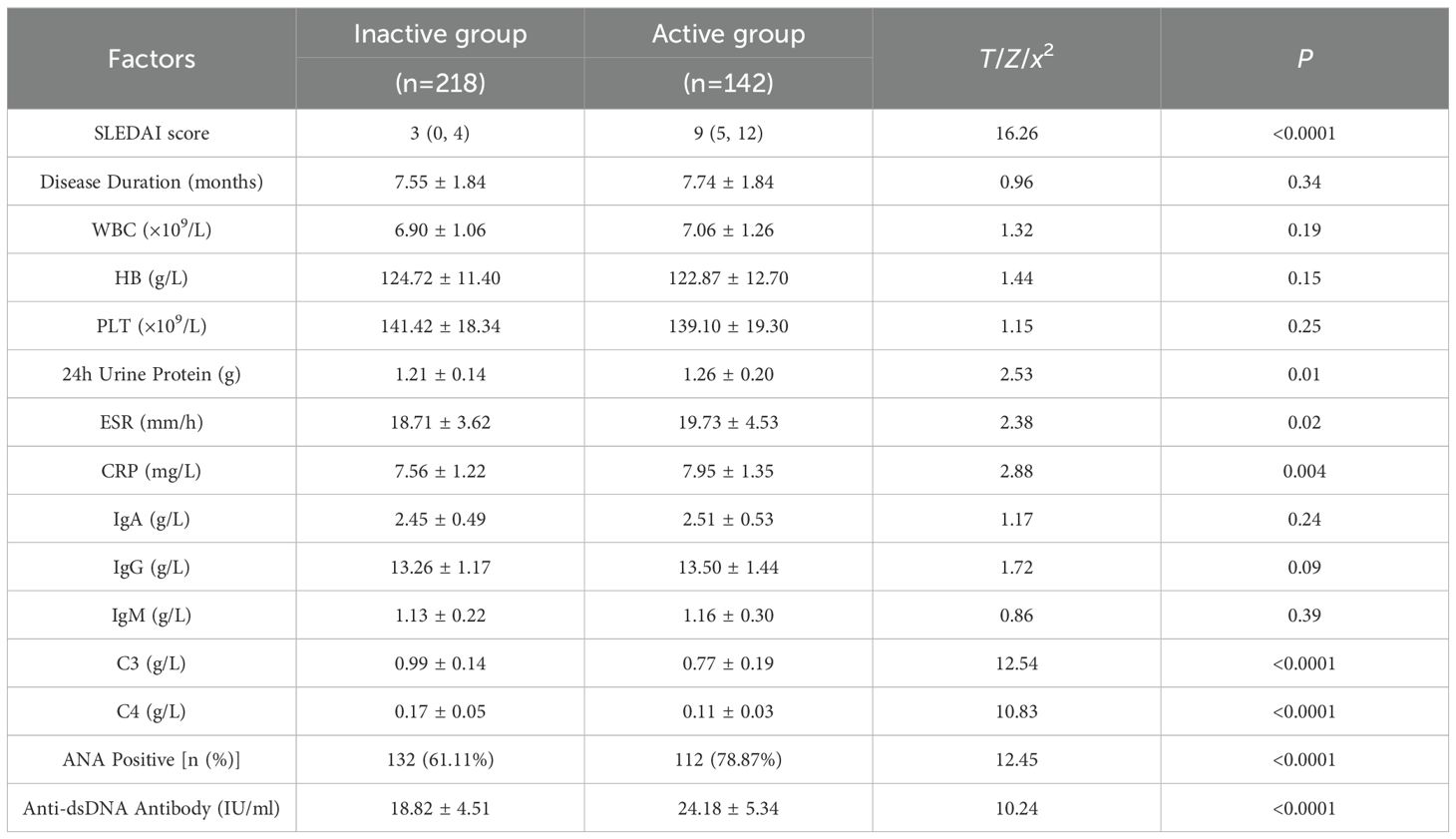 Based on the SLEDAI scores, SLE patients were divided into active and inactive groups. Clinical parameters were compared between the two groups. No significant differences were found in disease duration, WBC, HB, PLT, IgA, IgG, and IgM between the two groups (P > 0.05). However, the active group exhibited significantly elevated levels of immunological and inflammatory markers, ANA positivity, anti-dsDNA antibody levels, 24-hour urinary protein levels, ESR, and CRP. In contrast, serum levels of C3 and C4 were significantly reduced in this group (P< 0.05), indicating higher disease activity in active SLE patients. See Table 4.