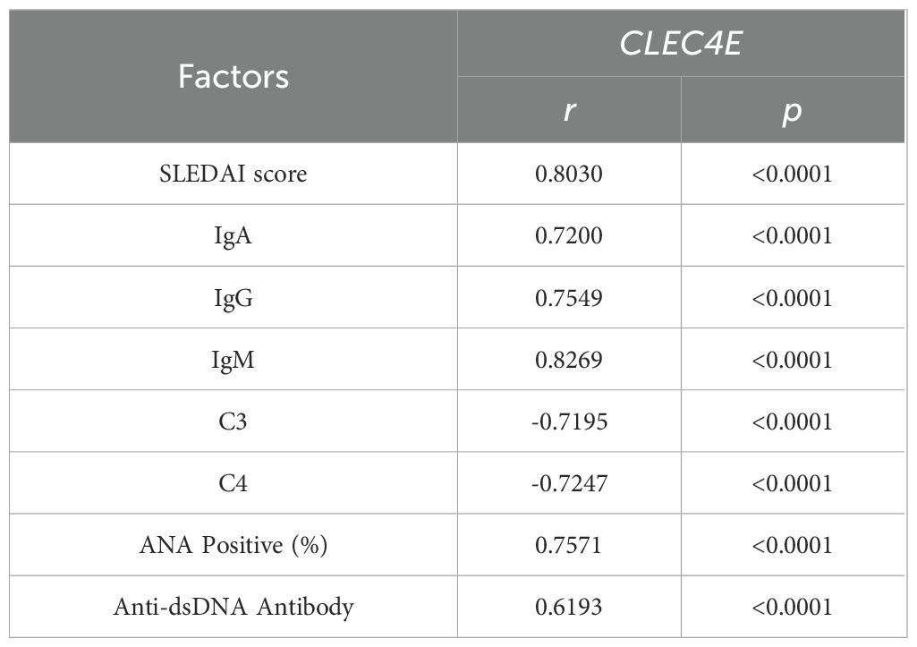 The correlation between CLEC4E and SLEDAI score, IgA, IgG, and IgM was 0.7200, 0.7549, and 0.8269, respectively (P< 0.0001), and negatively correlated with C3 and C4, with correlations of -0.7195 and -0.7247, respectively (P< 0.0001). In addition, the correlation of CLEC4E with ANA positivity and anti-dsDNA antibody was 0.7571 and 0.6193 (P< 0.0001), respectively (Table 5 and Figure 4).