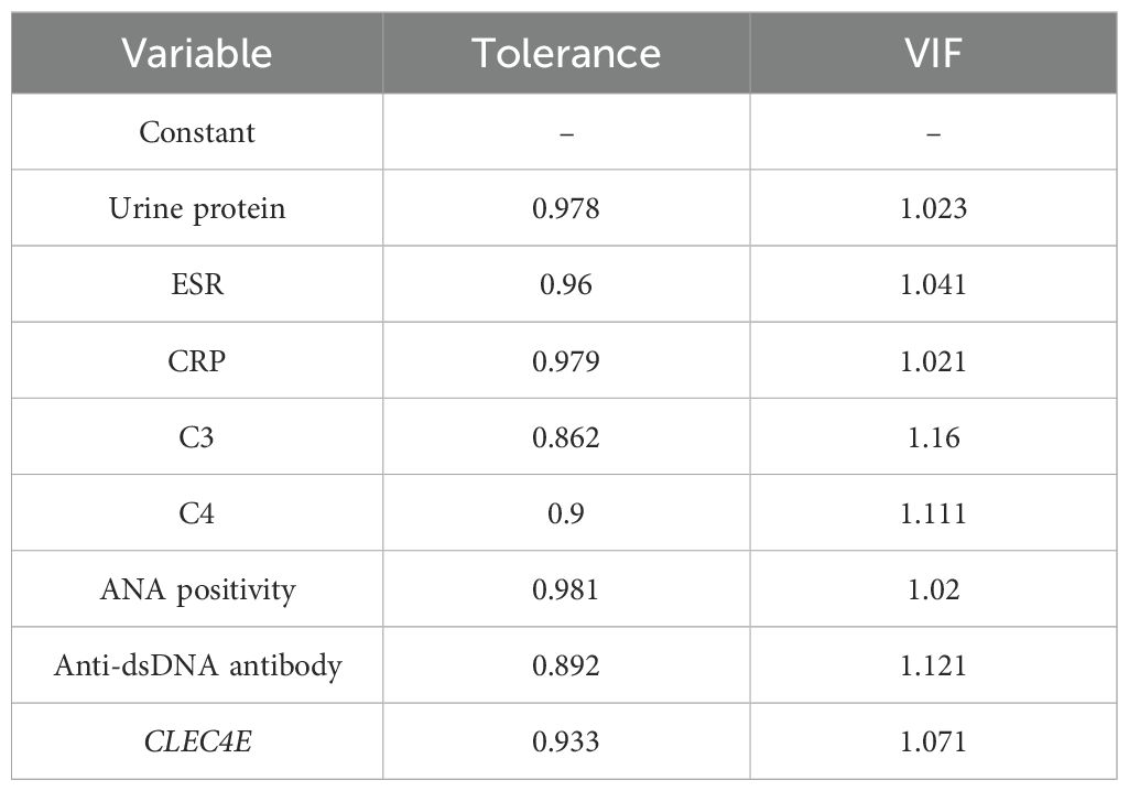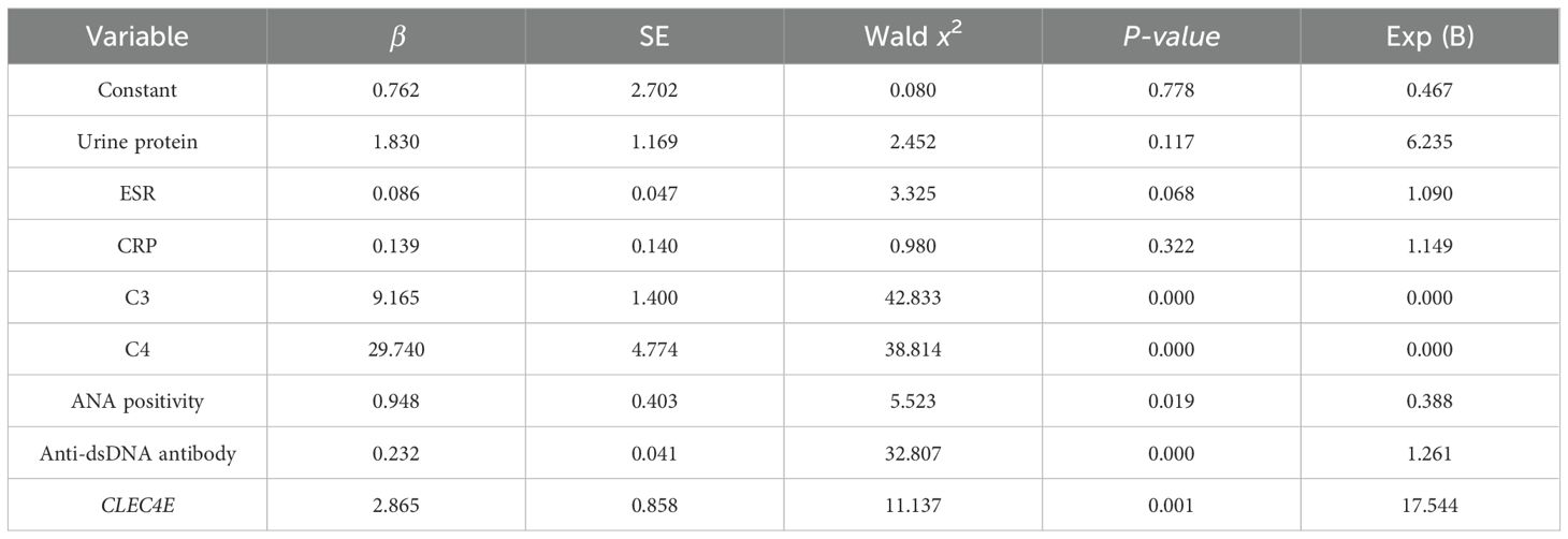 A multivariate logistic regression analysis was conducted to explore potential independent risk factors for disease activity in SLE. The factors with a P-value of<0.05 from the previous differential analysis were subjected to collinearity diagnostics. The results showed that the variance inflation factor (VIF) for all independent variables was less than 10, and the tolerance values for each variable were greater than 0.1, indicating that there was no significant linear correlation between the independent variables. Based on the conventional criteria for VIF and tolerance, no potential risk for multicollinearity was observed, as shown in Table 7. The regression analysis revealed that C3, positive ANA, anti-dsDNA antibodies, and CLEC4E expression levels were independent risk factors for SLE disease activity (P< 0.05). This suggests the potential prognostic value of CLEC4E in SLE progression. See Table 8.