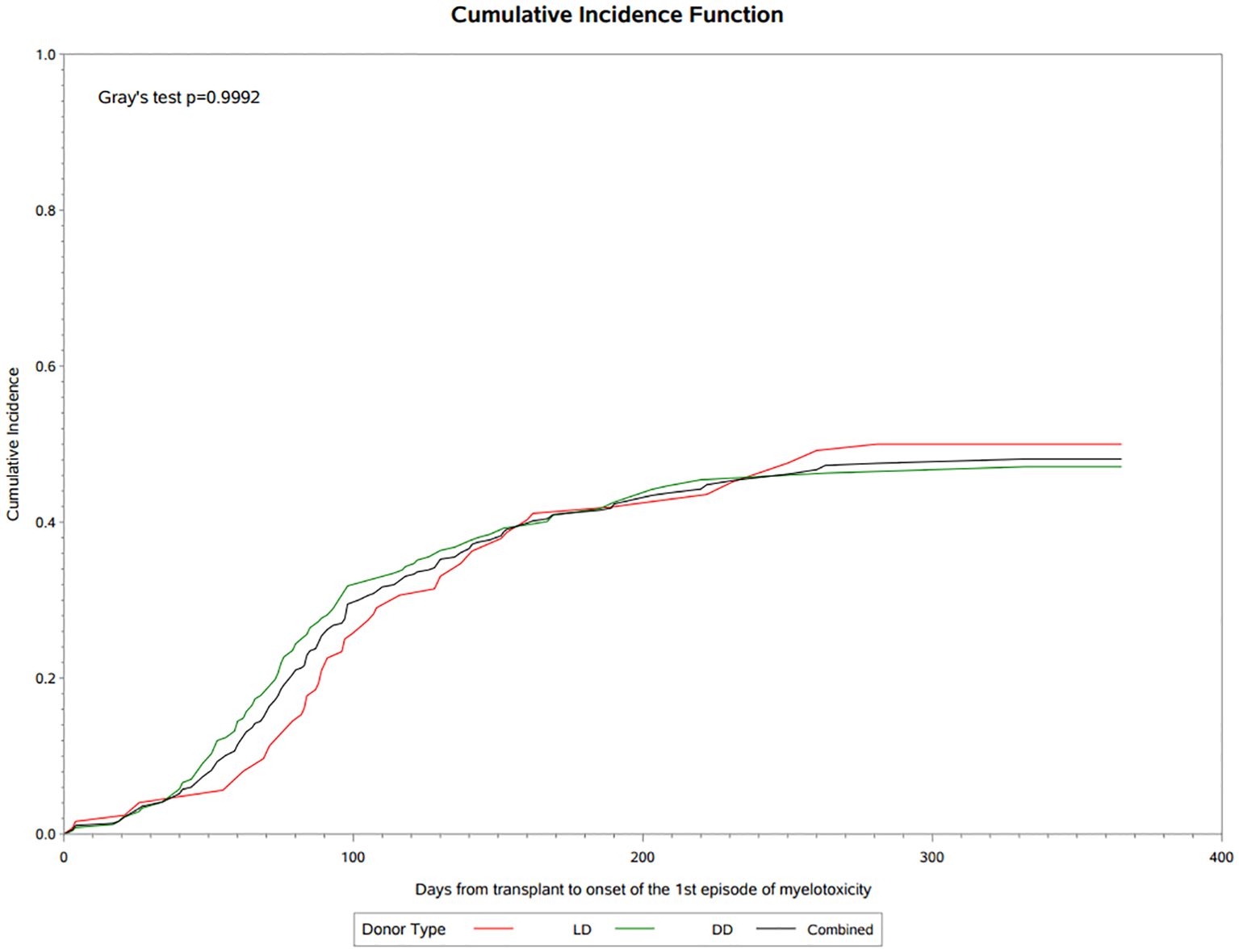 A total of 121 (38.9%) patients experienced antiviral related myelotoxicities classified principally as leukopenia or neutropenia, with a frequency that was similar in LD (39.8%) and DD (38.5%) recipients. Cumulative incidence analysis showed that myelotoxicity was observed within 30 days post-transplant, rising rapidly during the first 3 months to 34.5% at day 100 and 46.8% by the end of the first year of follow-up (Figure 2). The median onset was 90 (IQR 65, 133) days post-transplant, median duration was 30 (IQR 14, 74) days and only 6 patients (4.9%) had an NCI-CTCAE severity grade above 3. Immunosuppressive therapy was reduced in almost 80% of the patients with myelotoxicity, being decreased on 65(53.7%) or discontinued or interrupted on 43 (35.1%) of the 134 changes recorded, and antiviral therapy was similarly decreased or discontinued in 34 of the 50 (68%) patients on treatment at the time of myelotoxicity. Other agents such as trimethoprim-sulfamethoxazole were discontinued in 9.1% of patients and G-CSF was implemented in 22 (18.2%) patients during the episode of myelotoxicity. A second episode of myelotoxicity occurred in 14 (11.5%) of these patients at a median of 136 (IQR 89, 167) days, with a duration of 39 (IQR 24, 46) days, of which none had an NCI-CTCAE severity over grade 3. Immunosuppressive therapy was decreased, interrupted or discontinued in 94.5%, antiviral therapy discontinued or interrupted in 28.6% and G-CSF was started in 14.3% of these patients. A third or greater episode of myelotoxicity occurred in 5 (4.1%) of patients a median of 174 (IQR 161, 247) days post-transplant, lasting for 70 (IQR 60,80) days, in which no events were above Grade 2 severity. Immunosuppression was decreased or discontinued/interrupted in 2 (40%) patients, and antiviral prophylaxis discontinued or interrupted in 1 (20%) patient. No patients received G-CSF.