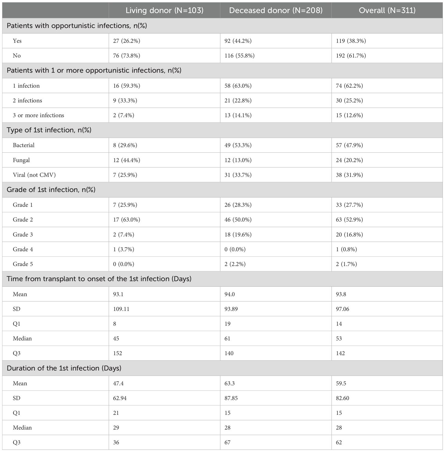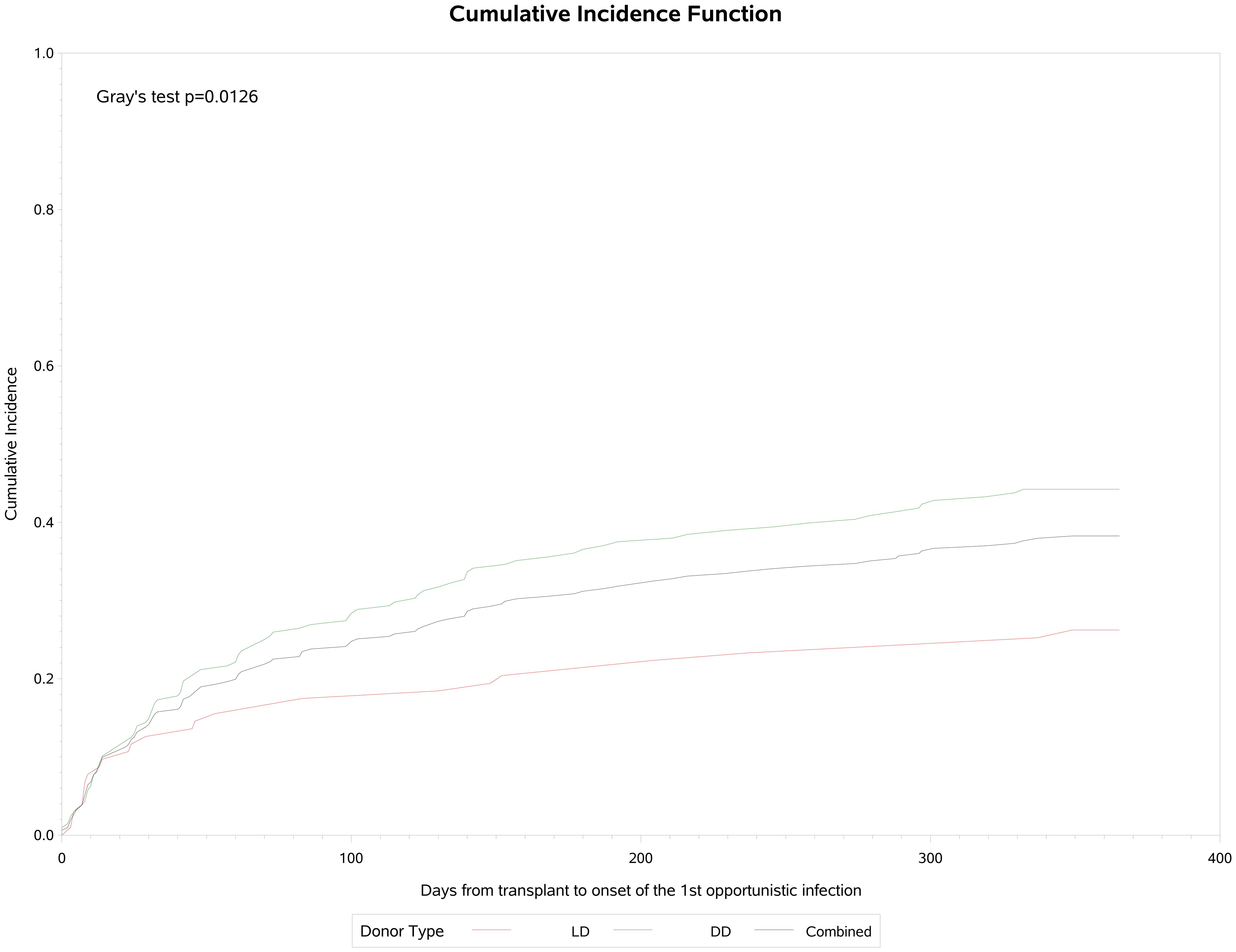 A total of 119 (38.3%) patients experienced opportunistic infections post-transplant, which were significantly more common in DD (44.2%) than LD (26.2%) recipients (p=0.002) (Table 4). Cumulative incidence analysis (Figure 3) showed that infections were first observed within 30 days post-transplant, rising to an inflection at 60–90 days and increasing slowly thereafter to approximately 38% by the end of the first year, with a median onset of 53 (IQR: 14, 142) days post-transplant and a median duration of 28 (IQR: 15, 62). Recurrent opportunistic infections were recorded in 45 (14.5%) of these patients, of whom 15 (4.8%) had three or more episodes. Median onset for the second and third or more episodes was 137 (IQR 77, 213) days and 181 (IQR 109, 236) days respectively, with a duration of 22 (IQR 14, 49) days and 29 (IQR 18, 50) days. Of the 179 total episodes of opportunistic infection reported, 98 (54.7%) were bacterial, 56 (31.3%) were non-CMV viral infections and 30 (16.7%) were fungal in origin. Almost all (97.8%) were Grade 1–3 in severity.