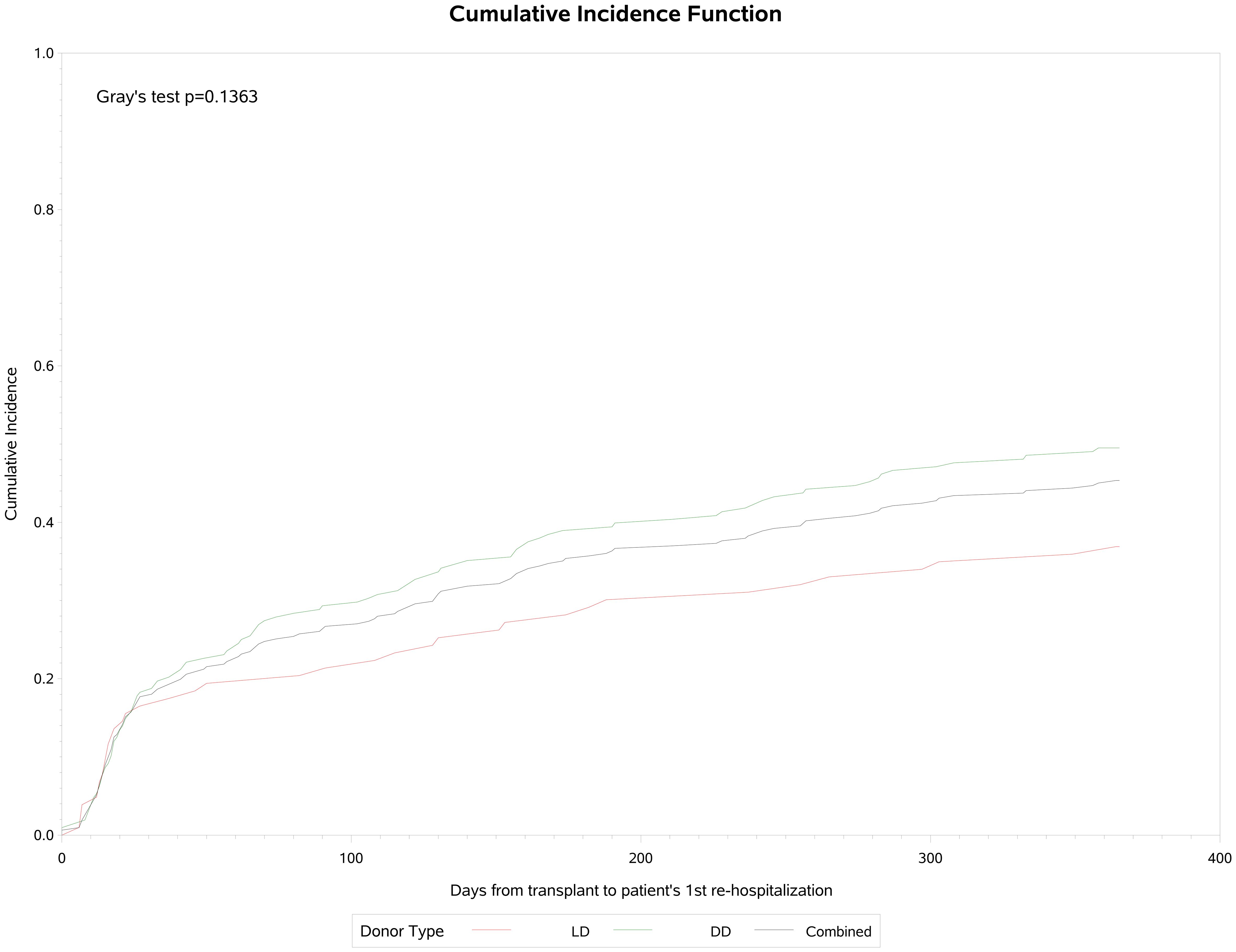 A total of 141 (45.3%) participants were re-hospitalized post-transplantation, 103 (36.9%) in the living donor and 38 (49.5%) in the deceased donor group. Of these admissions, 25 (17.7%) were related to CMV infection or leukopenia/neutropenia. Cumulative incidence analysis (Figure 4) showed that re-hospitalization commenced early, rising to 28% by day 30 and continuing to 45% by the end of the first year of observation. The median time to first re-hospitalization was 58 (IQR: 18, 158) days and the median duration was 5 (IQR: 2, 11) days. Of these patients, 9 (6.3%) required admission to ICU, for a median of 14 (IQR: 5, 14) days. Fifty (35,4%) of these 141 patients were re-hospitalized a second time, of which 6 (12%) were related to CMV infection or leukopenia/neutropenia. The median time to re-admission was 114 (IQR: 49, 205) days, and median duration was 6 (IQR: 4, 10) days. Two patients (4%) were admitted to ICU for a median of 2 days. And 31 (21.9%) patients were re-hospitalized 3 or more times of which 3 (9.6%) were for CMV infection or neutropenia. The third admission was a median of 145 (IQR: 95, 249) days post-transplant, lasting for a median of 7 (IQR: 3, 12) days and 2 were admitted to ICU for a median of 3 days.